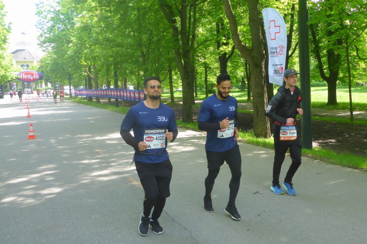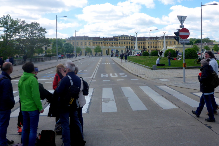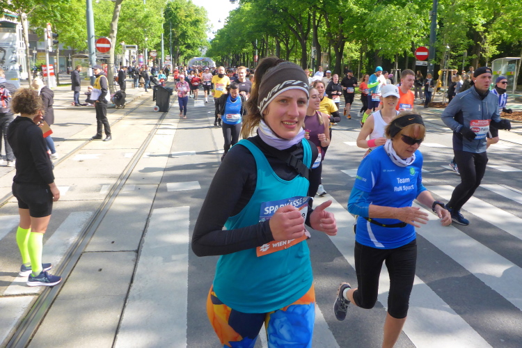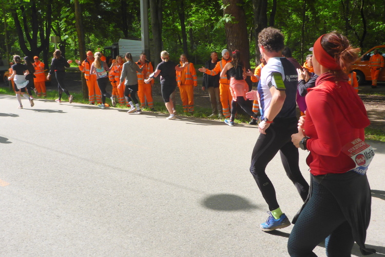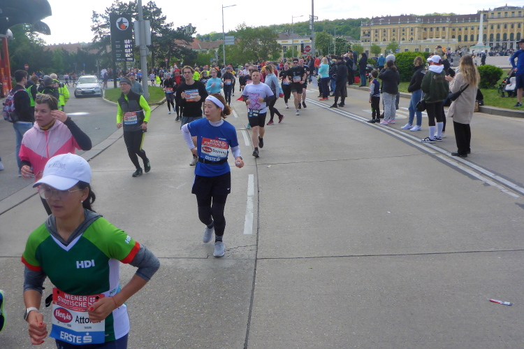 Die Sonne scheint inzwischen durchgehend und es ist Zeit, sich der ersten Kleidungsstücke zu entledigen. Eine schwierige Einschätzung, denn zwischendurch pfeift immer wieder ein eisiger Wind durch die Häuserblocks. Tanja lauert mir auf und ich gebe Buff und Handschuh ab, die Mütze darf noch bleiben. Die Strecke zieht sich flach durch die Stadt in westliche Richtung, wir erwarten den Wendepunkt bei Schloss Schönbrunn. Der nächste VP ist erreicht und der erste Wechselpunkt für die Staffeln bei 15,5 km. Der erste einer Staffel muss in Wien ganz schön was leisten, die nächsten Abschnitte fallen mit 8,6 km, 6,7 km und 11,4 km deutlich kürzer aus. So lassen sich auch langsamere und noch nicht sehr geübte Läufer schön in eine Staffel integrieren. Wir passieren Schönbrunn in etwas Entfernung kurz vor Kilometer 16, dann drehen wir wieder stadteinwärts.