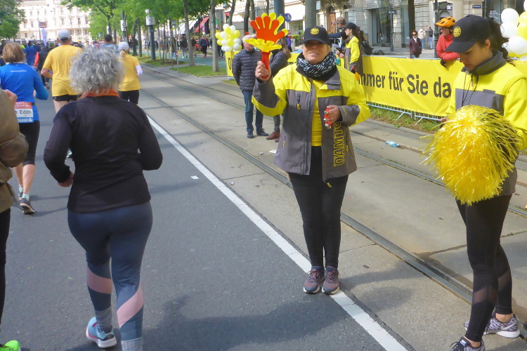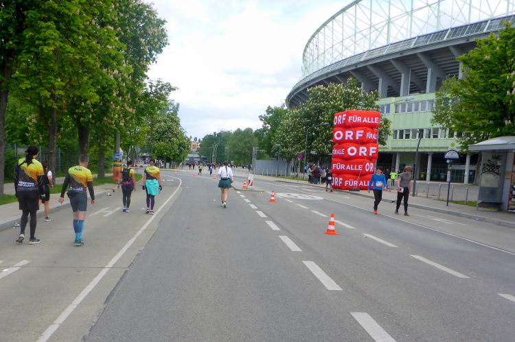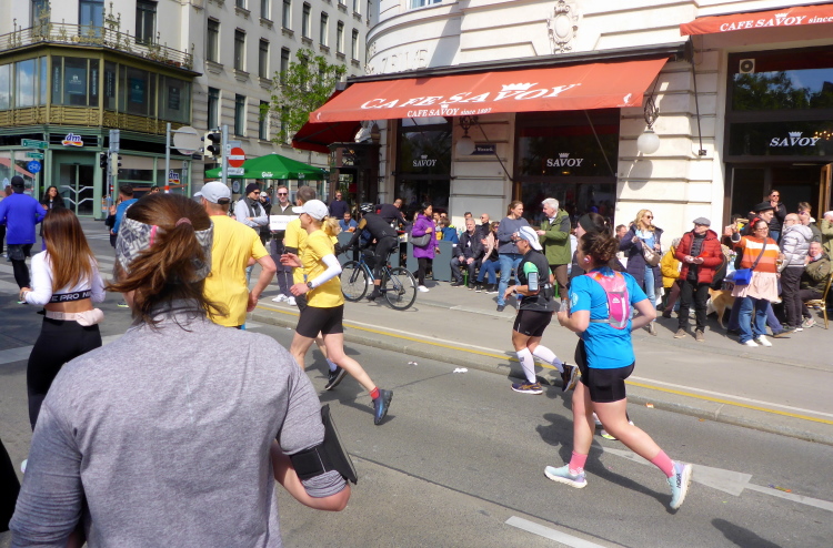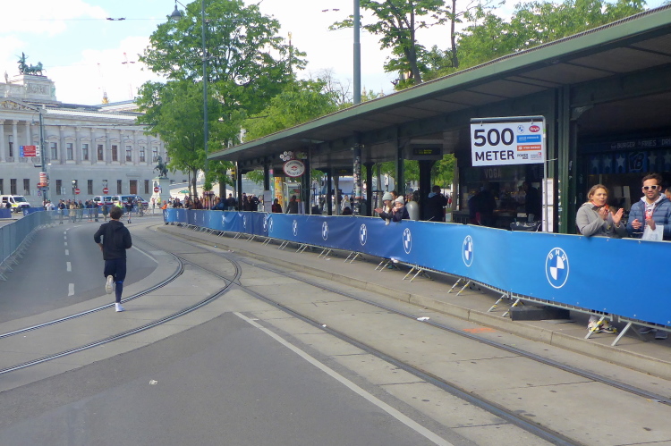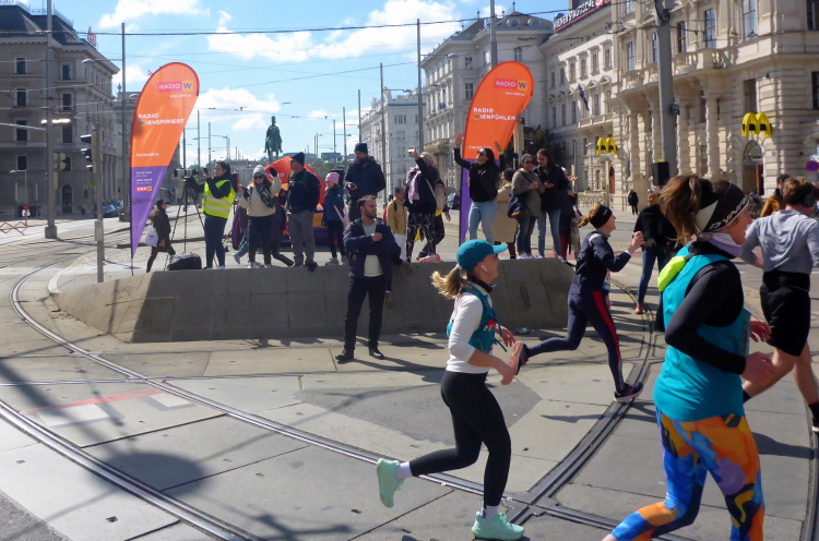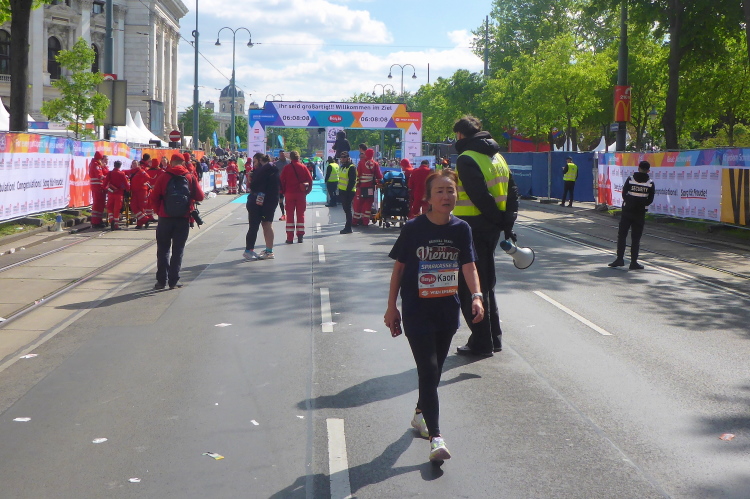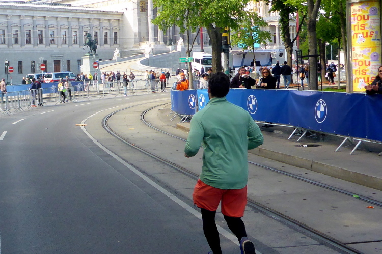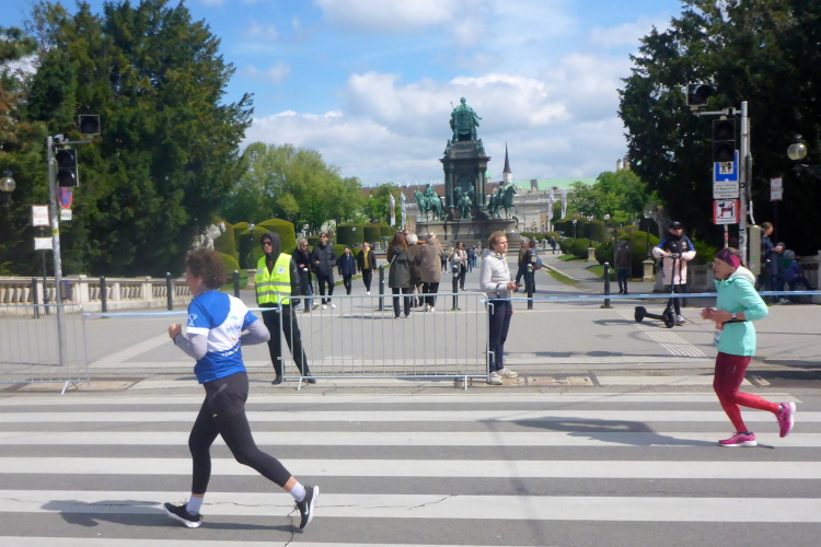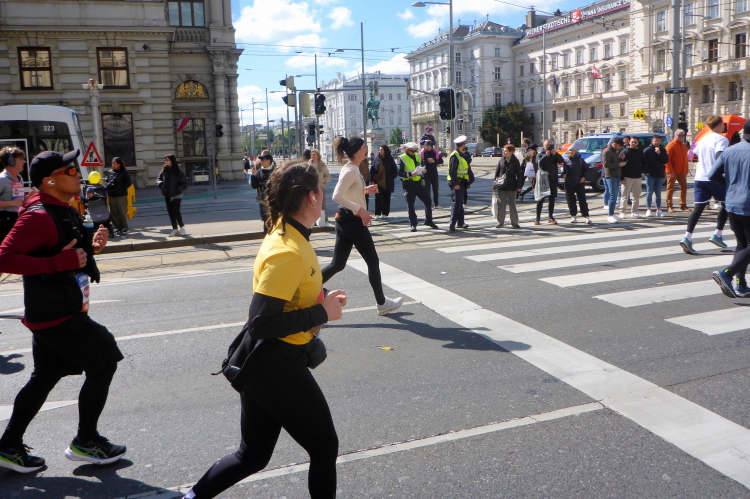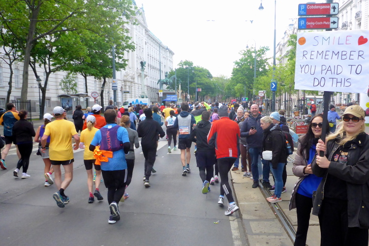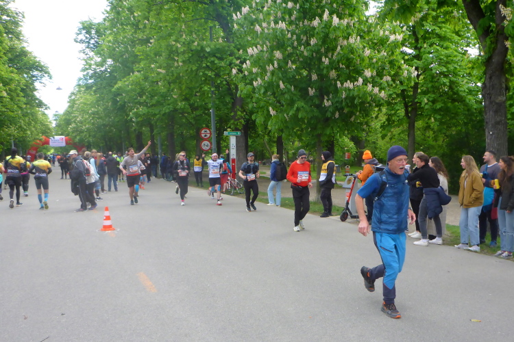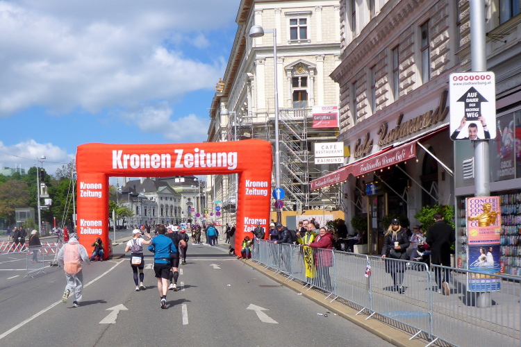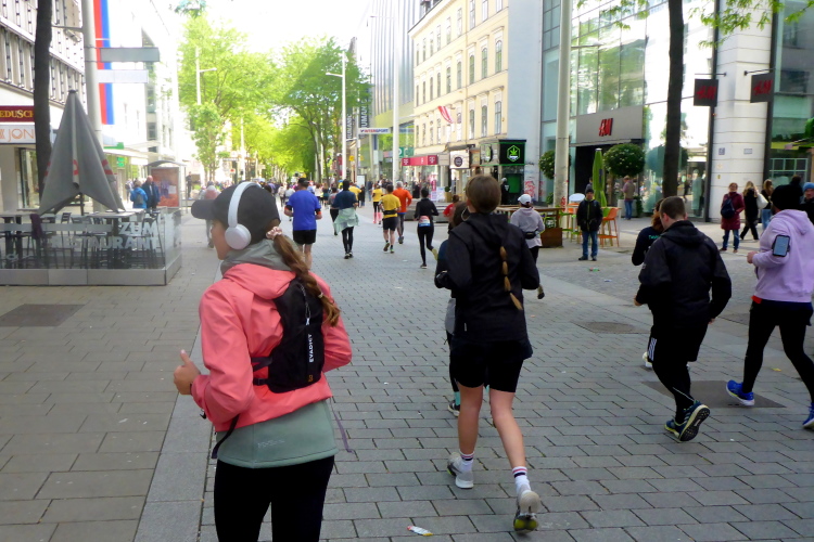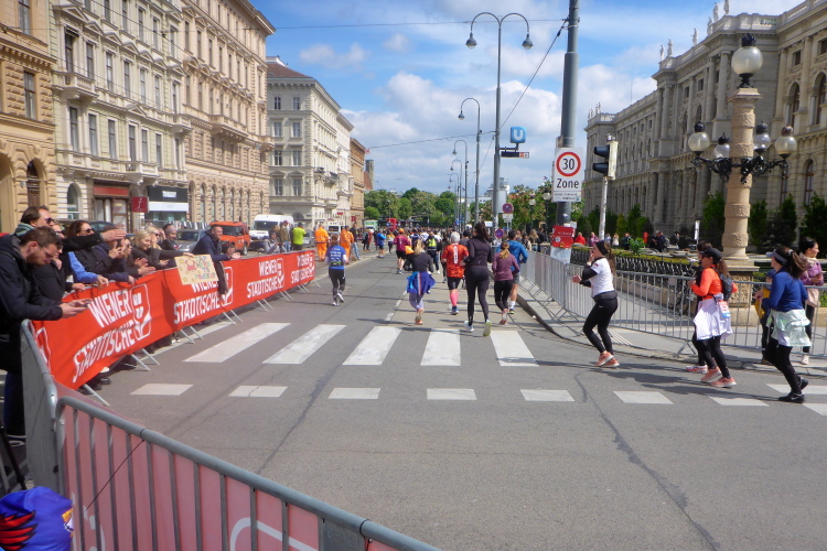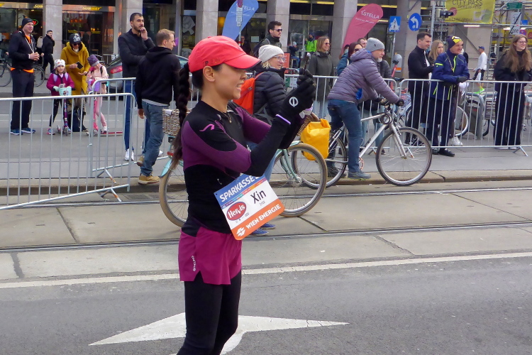 Wir dürfen einmal im Kreisverkehr drum herum und dann noch 2,5 km Rückweg über die Hauptallee antreten. Auf den dadurch entstehenden Begegnungsstrecken bekomme ich einige Läufer vor die Kamera. Der Mythos ist ein echter Kampf! Es geht zurück Richtung Innenstadt parallel zu den Kilometern 5-9 und bei 40 erreichen wir wieder den Ring. Noch einmal über den Schwarzenbergplatz auf der Prachtstraße bis zur Hofburg. Auf der vorhin schon passierten Bühne ist jetzt Mitläuferin Xin zu sehen. Sie erfreut sich an der metergroßen Übertragung und schießt davon noch eine Erinnerung. Auf der Bühne geht es danach zu einer Rap-Aktion über und wir werden Richtung Ziel gefeuert. Die Cheer-Leader haben wir knapp verpasst.
