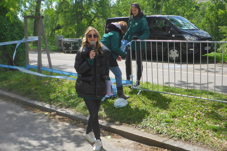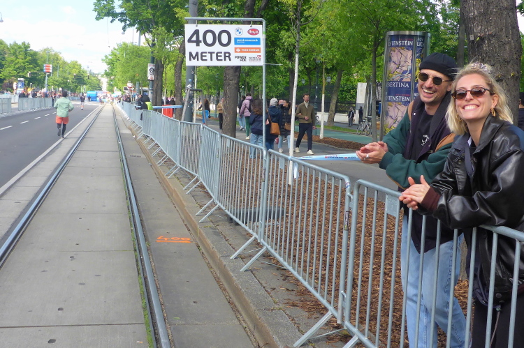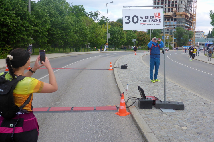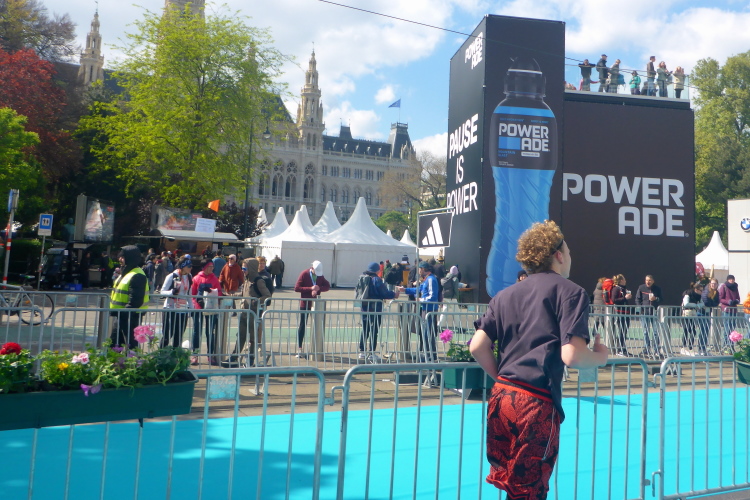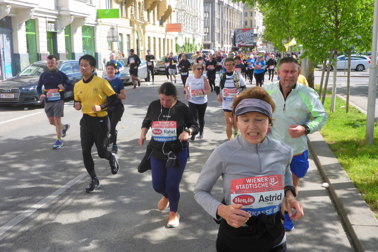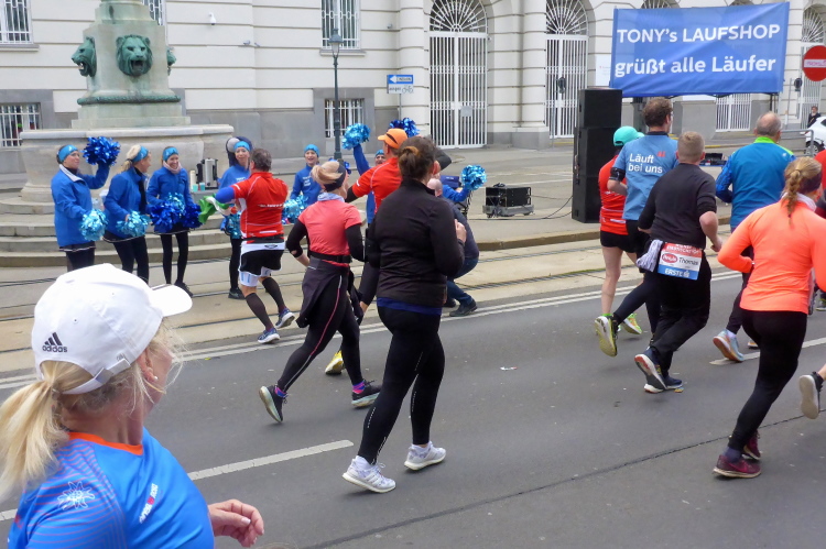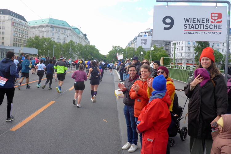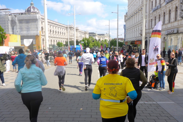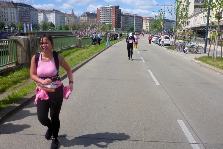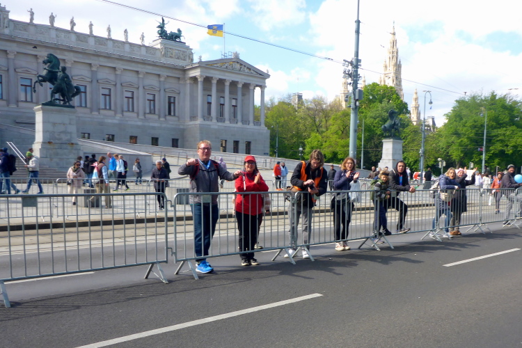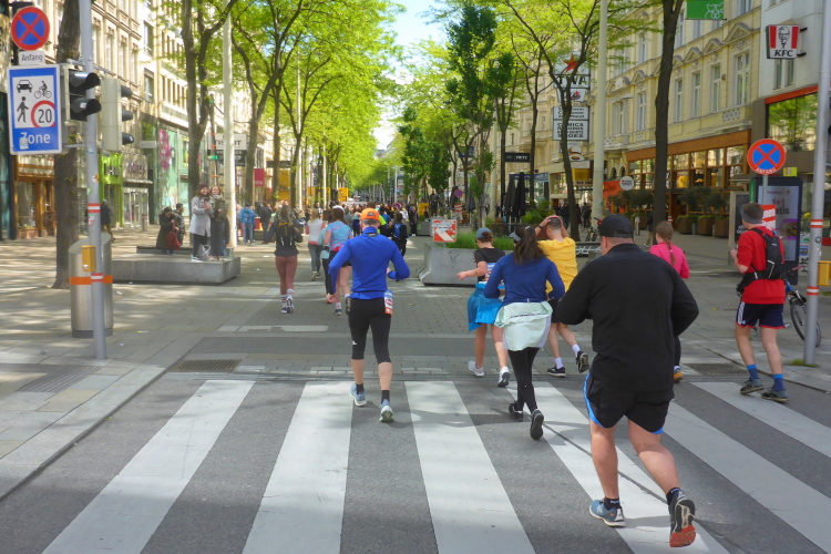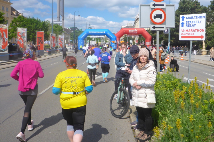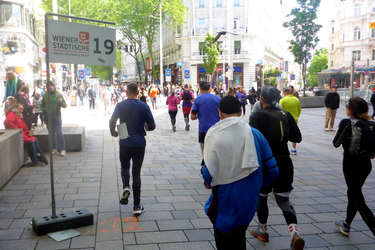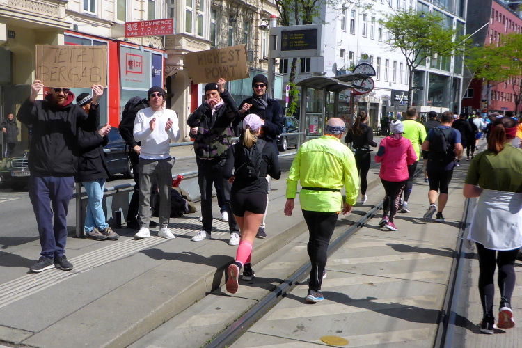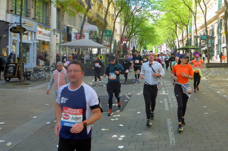 Wir dürfen einmal im Kreisverkehr drum herum und dann noch 2,5 km Rückweg über die Hauptallee antreten. Auf den dadurch entstehenden Begegnungsstrecken bekomme ich einige Läufer vor die Kamera. Der Mythos ist ein echter Kampf! Es geht zurück Richtung Innenstadt parallel zu den Kilometern 5-9 und bei 40 erreichen wir wieder den Ring. Noch einmal über den Schwarzenbergplatz auf der Prachtstraße bis zur Hofburg. Auf der vorhin schon passierten Bühne ist jetzt Mitläuferin Xin zu sehen. Sie erfreut sich an der metergroßen Übertragung und schießt davon noch eine Erinnerung. Auf der Bühne geht es danach zu einer Rap-Aktion über und wir werden Richtung Ziel gefeuert. Die Cheer-Leader haben wir knapp verpasst.
