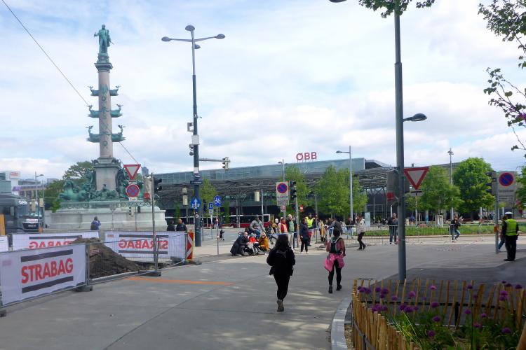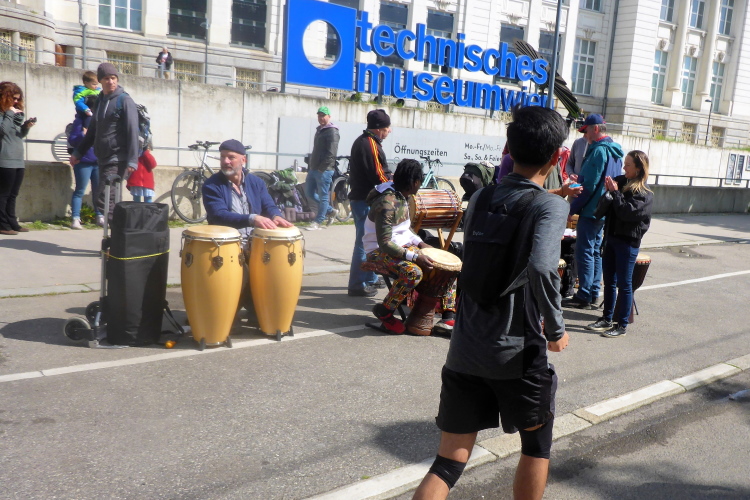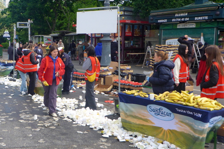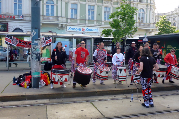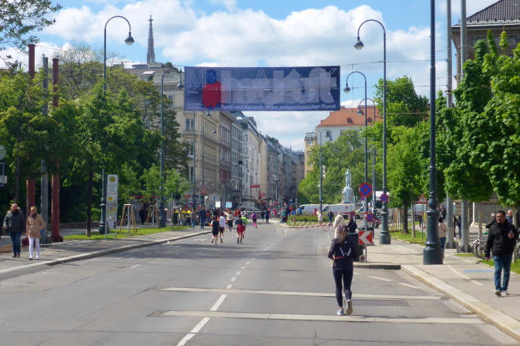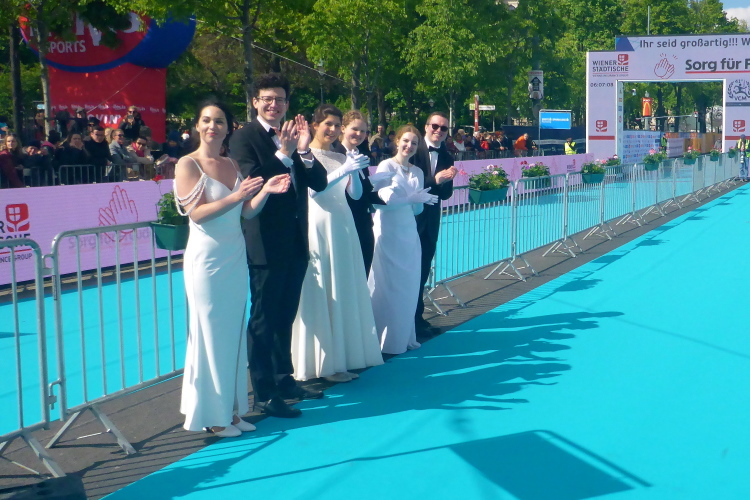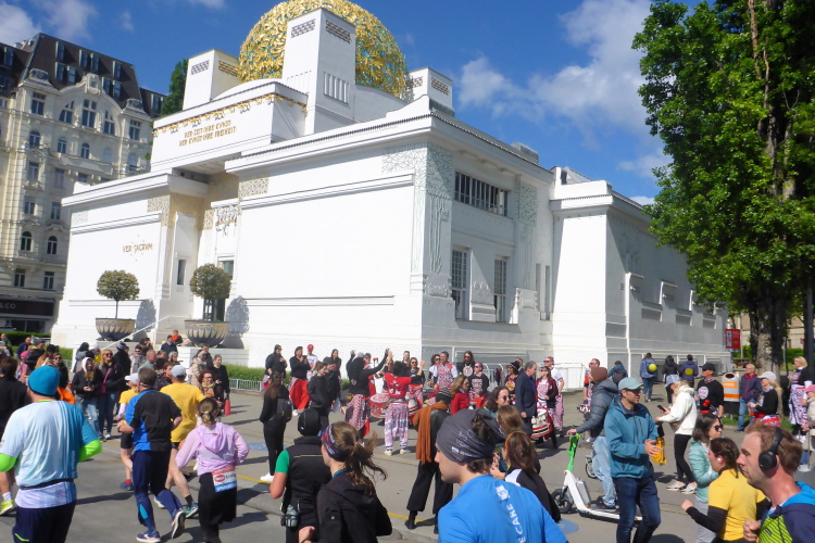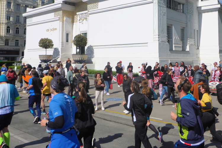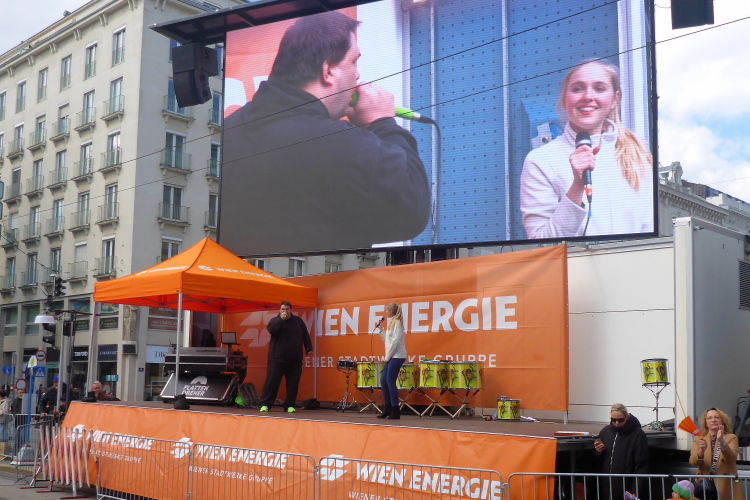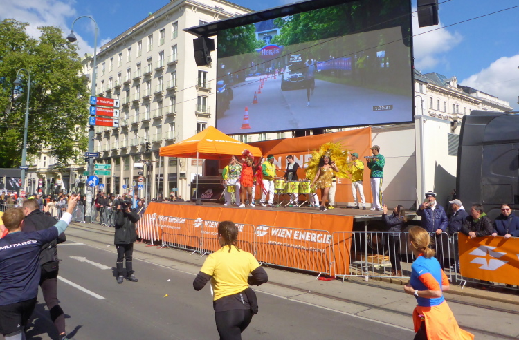 Der Track über die Ringe führt uns über den Schwarzenbergplatz, nach gestern auf den 5K das zweite Mal, und wie ich aus der Vorbereitung weiß, später noch ein drittes Mal. Auf einer großen Bühne läuft eine Leinwand und zeigt gerade die Spitze an. Wie Fernsehschauen, vom Tempo her eine andere Welt! Auf der darunter liegenden Bühne tobt sich gerade eine Sambagruppe aus, heiße Rhythmen und heiße Kostüme der Tänzerinnen lenken schnell von der rasenden Marathon-Spitze ab.