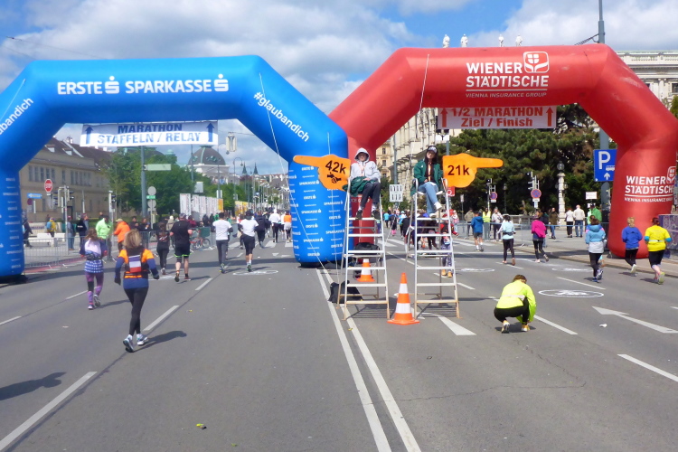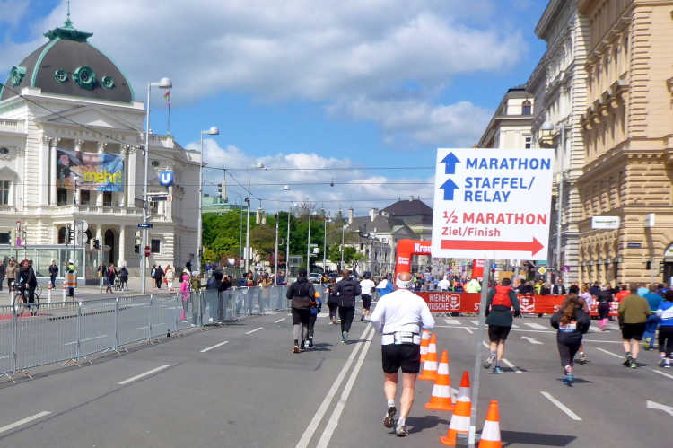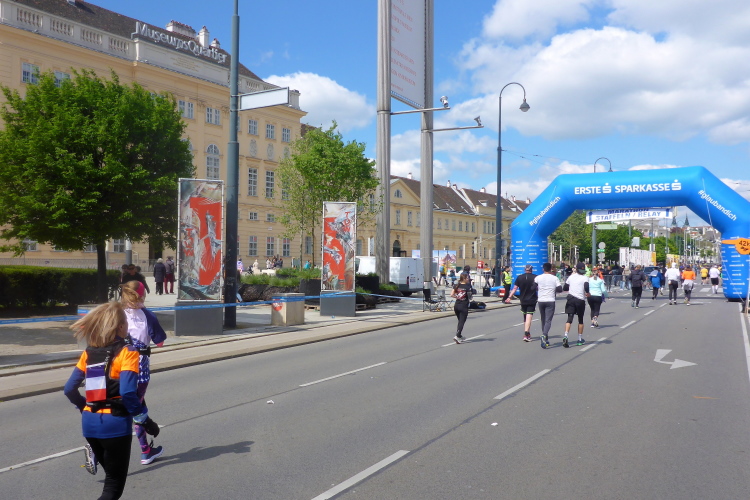 An der TU vorbei, stets angefeuert, immer wieder musikalische Hot Spots, geht es über Straßenbahnschienen und Fußgängerzonen immer weiter zurück Richtung City, sogar teils spürbar angenehm bergab. Kurz hinter der 20 sind wir im Museums-Quartier und die Streckentrennung steht an. Die Halbmarathonis dürfen rechts ab durchs rote Tor zum Ziel am Burgtheater, die Staffeln und Marathonis begeben sich durch das blaue Tor und starten die 2 Hälfte. Schilder, ein blinkendes Display und Helfer mit Schildern, wer das verpasst verläuft sich auch in seiner Küche.