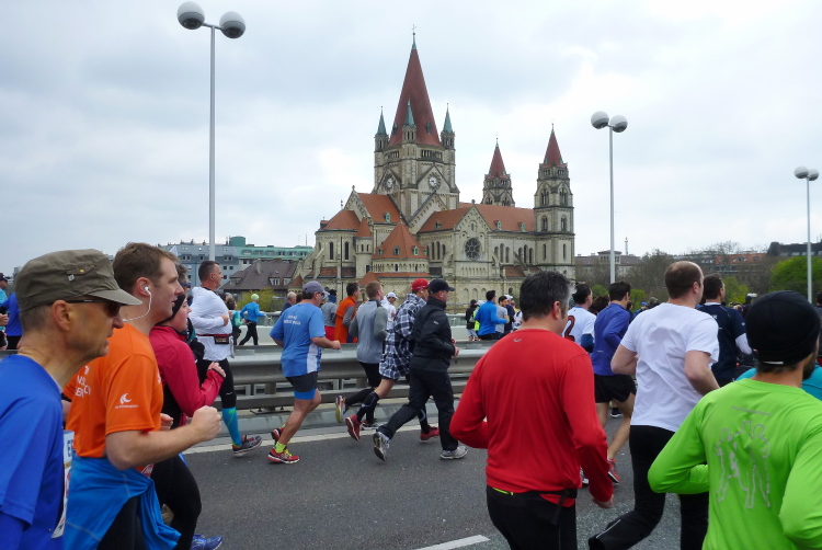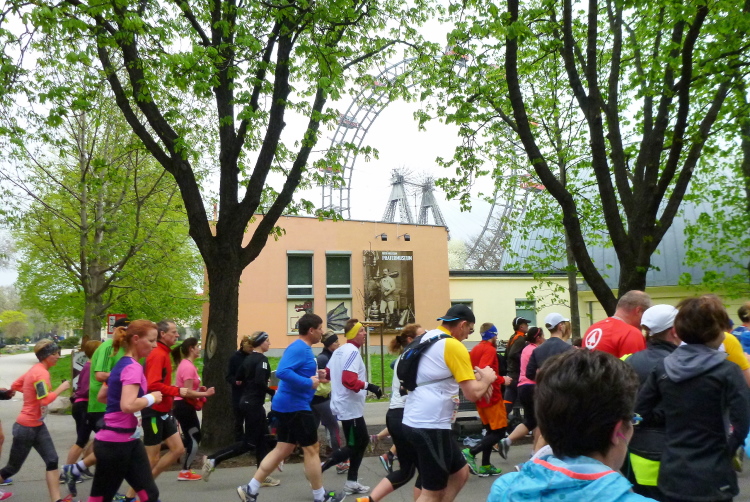 Schon auf der Lasallestraße unterwegs, grüßt links die markante dem Kölner Vorbild Groß St. Martin nachempfundene Franz-von-Asisi-Kirche, kurz dahinter, das gleichermaßen bekannte wie markante Riesenrad, das den letzten Krieg glücklicherweise nur teilzerstört überlebt hat. Zum Prater erzähle ich ein paar Takte auf dem hier wieder vorbeiführenden Rückweg, einstweilen dürft Ihr Euch erst einmal an den Fotos erfreuen. Nach Umrundung des Tegetthoff-Denkmals kommen wir bald auf die breite Prater Hauptallee, die ganz offensichtlich zu den beliebtesten Wiener Laufrevieren gehört, auf ihr kommen wir gut voran. Nicht nur Klaus und ich nutzen den rechts von der Teerstraße verlaufenden weichen Reitweg. Die erste von zahlreichen Verpflegungsstationen versorgt uns mit dem Nötigsten (Wasser, Iso, Bananen, ab km 34 auch Cola). Auf Höhe des Ernst-Happel-Stadions biegen wir rechts zum Donaukanal ab, dem wir für drei km bis zum neunten folgen werden.