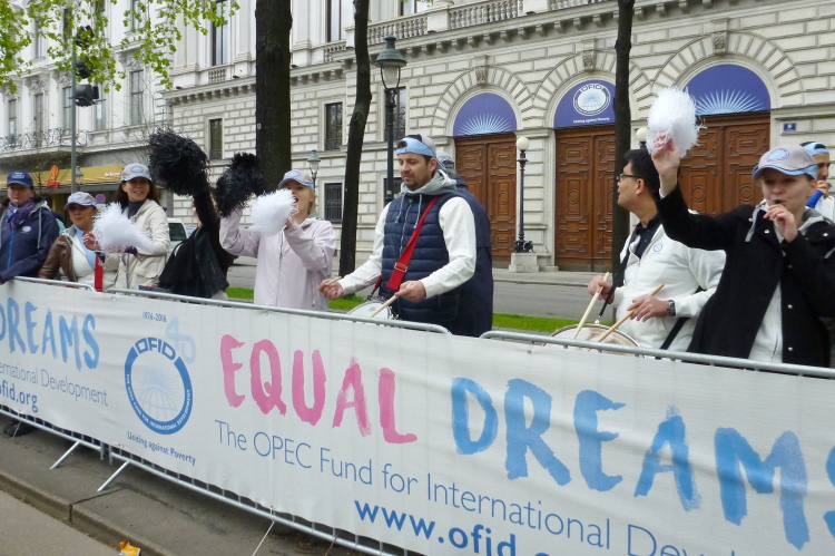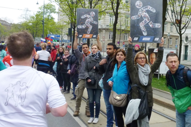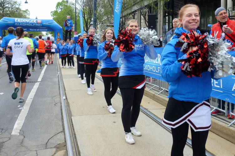 Im Gegensatz zu letztem Jahr nutzen wir mit der Aspernbrücke eine früher gelegene zur Überquerung des Kanals, genießen allerdings vorher noch die Anfeuerung durch eine erste Cheerleader-Gruppe, die ob des kalten, windigen Wetters leider viel zu gut verpackt ist. Links von uns, über der Urania (Volksbildungshaus mit Sternwarte), liegt der Wienfluss. Ja, jetzt staunst Du! Wien lag also ursprünglich an der namengebenden Wien, einem wirklichen Flüsschen, mit unserer heimischen Wied vergleichbar. Bevor jetzt einer zu lästern beginnt: Wie war das nochmal mit Düssel-Dorf am Rhein?