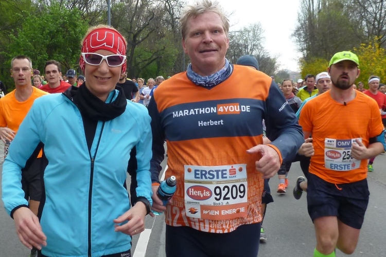 Das ist doch schön: Ein sehr bekanntes T-Shirt mit sehr bekanntem Rücken und ebensolchem Laufstil taucht vor uns auf. Kollege Herbert ist, gemeinsam mit seiner Lauffreundin Margit, ebenfalls in seiner Landeshauptstadt unterwegs. Wir freuen uns über das unverhoffte Wiedersehen. Attraktive Bürgerhäuser zur rechten, ein Grünstreifen mit dahinter liegendem Donaukanal zur linken, so lässt es sich gut laufen. Überall in der Stadt hängen Plakate zur Bundespräsidentenwahl. Im Gegensatz zu unserer Bundesversammlung wird der Präsident hier unmittelbar vom Volk gewählt. Wie bei den Amis der Donald, tritt hier mit dem „Mörtel“, dem Bauunternehmer Richard Lugner, ebenfalls eine schillernde Figur zur Wahl an. Allerdings chancenlos, wenn ich den Bemerkungen um mich herum Glauben schenken darf.
