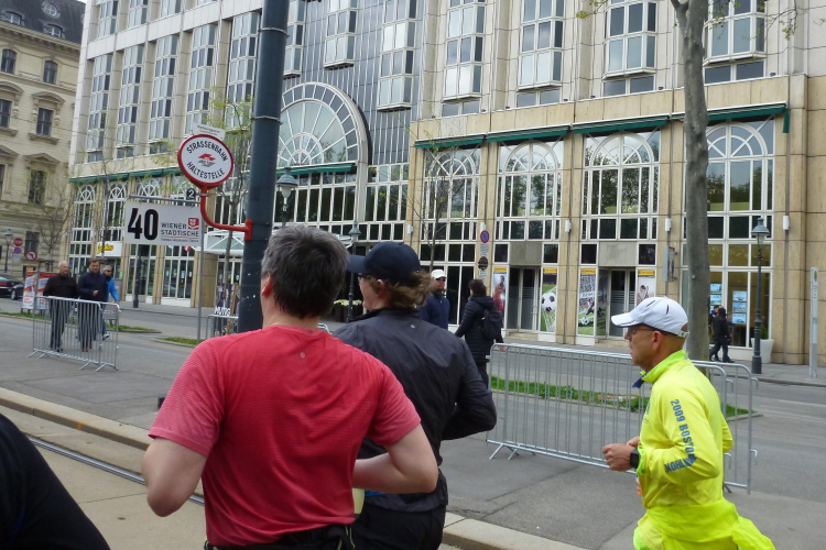 Das Marathonlaufen, so oft ich es auch schon gemacht habe, wird mir erfreulicherweise nie zur Routine. Jedes Mal ist es für mich ein erhebendes Gefühl, in der Gewissheit dabei sein zu können, es unter normalen Umständen auch zu schaffen. Schon ist die Donauinsel überquert und wir nehmen Kurs auf den Praterstern, einen Verkehrsknotenpunkt. Wir auf der rechten Fahrbahn Gestarteten laufen rechts, die links Gestarteten links herum. Weil der Weg rechts herum etwas länger ist, standen wir auch ein paar Meter vor den linken Blöcken. Daher ist auch klar, warum es bei Androhung der vorläufigen Erschießung auf den ersten drei km verboten ist, die Straßenseite zu wechseln.