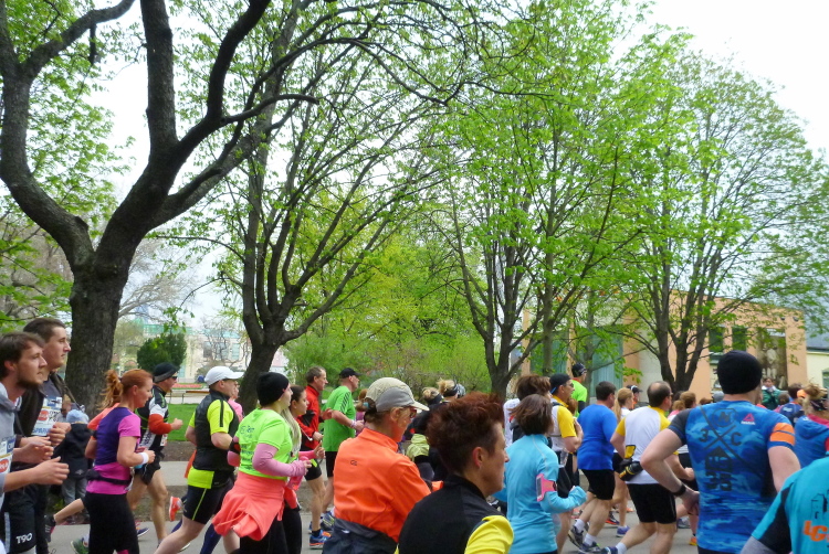 Entlang der Wien, die hier in einem gemauerten, tiefen Graben verläuft, lässt es sich auf deren linken Seite im Folgenden gut vorankommen. Das soll aber nicht heißen, dass nach Belieben gelaufen werden kann. Auf der ersten Streckenhälfte ist trotz breiter Straßen sehr viel los. Einerseits ist das natürlich schön, wenn einem die Zeit egal ist, andererseits wäre kräfteraubendes Slalomlaufen erforderlich. Lasst Euch übrigens von den Fotos nicht täuschen: Auch wenn die Sonne manchmal kurz hervorschaut, es bleibt mehr als frisch, insbesondere durch den eiskalten Wind.