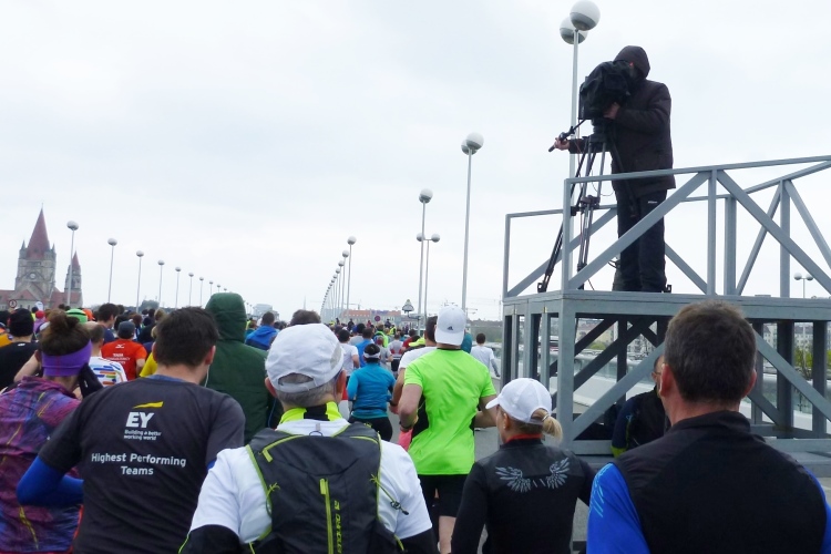 Schon sind wir auf der Reichsbrücke und überqueren diesen großen europäischen Fluss. Gleich zu Anfang passieren wir die erste von mehreren großen Videowänden, auf denen wir das aktuelle Renngeschehen an der Spitze bis schließlich zur Siegerehrung mitverfolgen können, eine prima Einrichtung. Die Reichsbrücke, auf der wir uns noch befinden, ist der dritte Bau an gleicher Stelle. Die Vorgängerin, eine 1937 errichtete Kettenbrücke, war 1976 spektakulär auf voller Donaubreite ins Wasser gestürzt. Sie war als Symbol für den Reichtum und die Größe Wiens inszeniert und in den späten 1930er Jahren neben Stephansdom und Riesenrad zum dritten Stadtemblem Wiens erklärt worden.