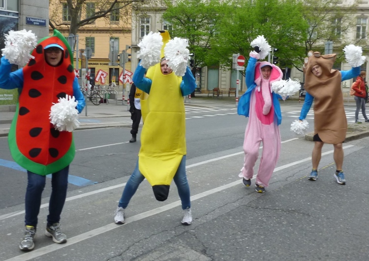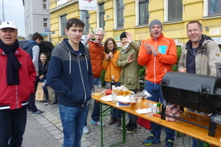 Am Praterstern, den wir nach gut 27 km erneut erreichen, befinden wir uns wieder auf der 4,4 km langen schnurgeraden Prater Hauptallee, die wir ganz zu Anfang des Laufs schon einmal zur Hälfte bewundern durften. Sie führt vom Praterstern zum Lusthaus und entstand 1538 durch Rodungen im Auwald, um eine Verbindung zwischen dem Palais Augarten und dem kaiserlichen Jagdgebiet im Prater herzustellen. Sie besteht aus der Hauptfahrbahn und beidseitigen Reitwegen und Fußgängerpromenaden. Dazwischen wurden mehrreihig Kastanienbäume gepflanzt. Die Burschengruppe, die dort mit mobilem Verstärker steht und jede Menge Alarm verbreitet, bietet ihr Gösser-Bier aus Dosen so nachhaltig an, dass ich diese zusätzliche Verpflegung gerne mitnehme.