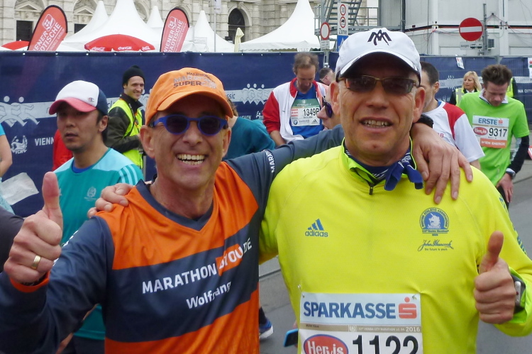 Für den Verlust des Heldenplatzes entschädigt werden wir auf den letzten Metern mit dem Parlamentsgebäude zur Linken, dem Volksgarten zur Rechten, dem Rathaus zur Linken und final dem Burgtheater zur Rechten. Dieses tolle Bauwerk ist übrigens namensgebend für die diesjährige Ausgabe („Theater der Emotionen“). Noch zweihundert Meter auf rotem Teppich, dann laufen Klaus und ich mit gemeinsam hochgerissenen Armen voll emotional über die Ziellinie. Geschafft!