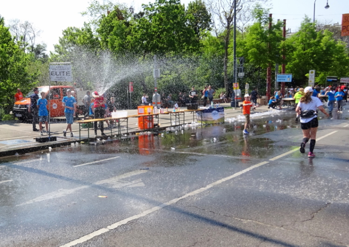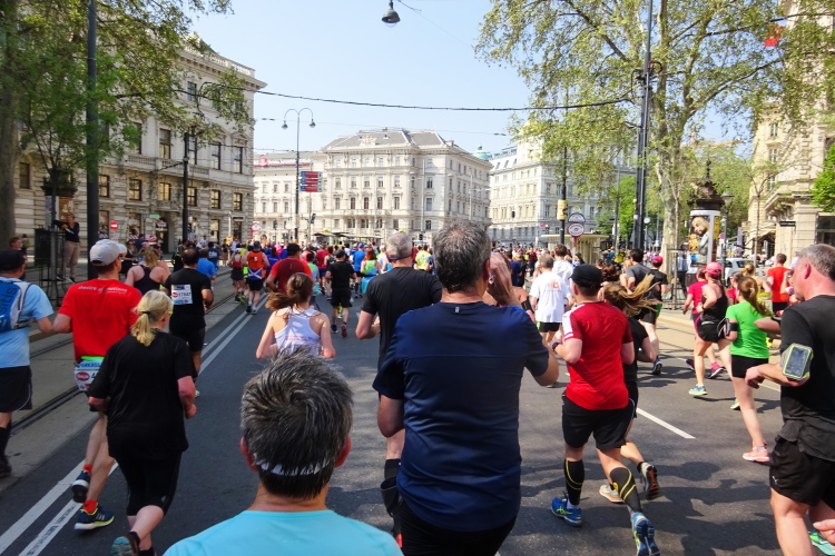 Es geht zunächst rund 2 km durch die Allee, dann dreht der Marathon in Richtung Donaukanal. Bei der Labe – Wiener Hochquellwasser vom Hydranten wird in Bechern angeboten – auch die Gatorade ist en gros verfügbar – drängen sich Tausende. Nach dem kurzen Anstieg auf die im II. Weltkrieg zerstörte und 1951 wieder eröffnete Aspernbrücke über den Donaukanal verharre ich für ein paar Fotos kurz an der Ecke. Bei Kilometer 9 kommen wir zum 1910 errichteten Volksbildungshaus Urania mit Sternwarte, deren Baustil eine Mischung aus Jugendstil und Klassizismus repräsentiert – und als Baujuwel anerkannt ist. Wir laufen am Wiener Stadtpark, der bereits auf die Biedermeierzeit zurückgeht, vorbei, ein beliebter Hotspot für Hop-on, Hop-off-Städtetouristen. Im Kursalon finden Tanzaufführungen statt, das Denkmal des Walzerkönigs Johann Baptist Strauss ist ein beliebtes Fotomotiv. Und der als Rinnsal durch ein Betonbett in den Donaukanal führende „Wienfluss“ verleiht dem Park zusätzliches Flair zum Flanieren links und rechts des gut 5 Meter tiefer legenden Flussbettes.