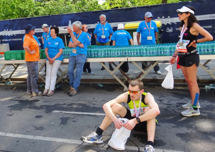 Börni Keiler, der von hinten kommend nachrückt, scheint heute gut drauf zu sein – er zieht in Richtung Alsergrund davon. Die noch wartenden Staffelläufer/innen bei der Station 2 (21,1 km) sind deutlich weniger geworden, aber immer noch warten Hunderte auf ihren Teamkollegen bzw. die -kollegin. Ein Pärchen hat bei der Uni ein Transparent aufgespannt: „Läufer sehen sexy aus – DU bist der Beweis dafür!“ Mich können sie nicht gemeint.
