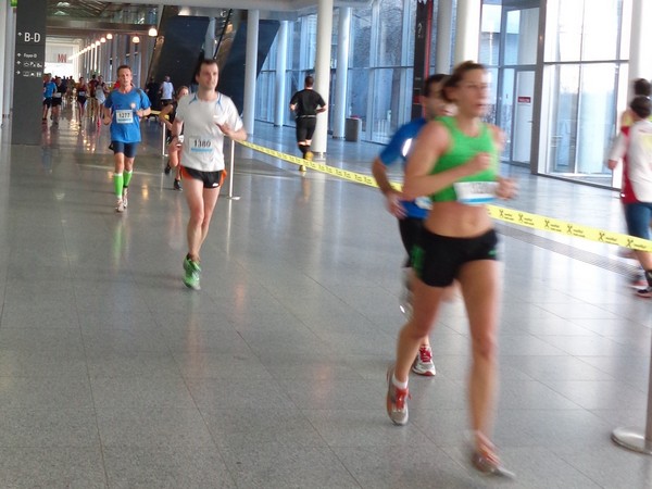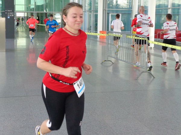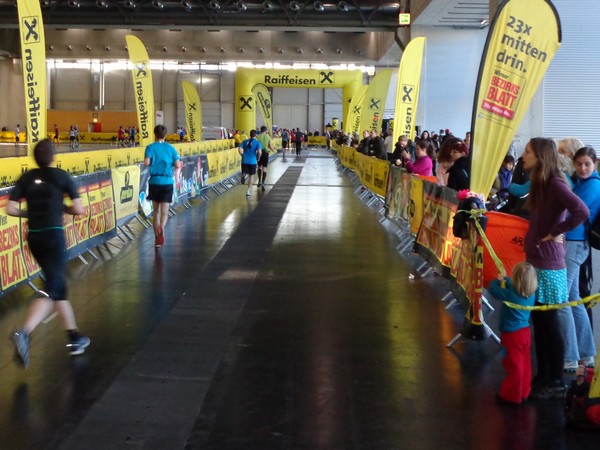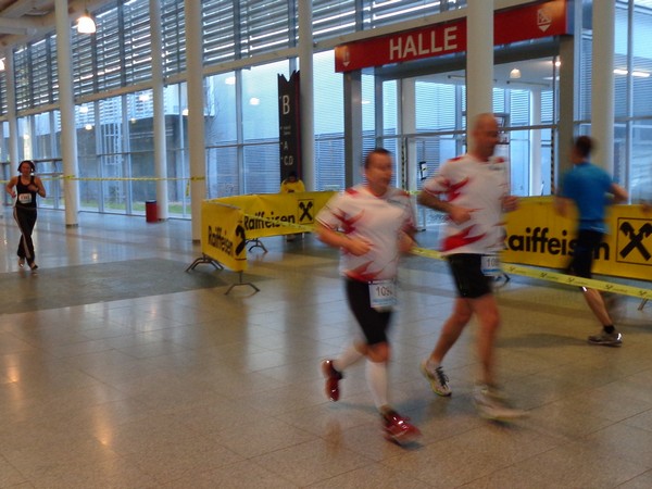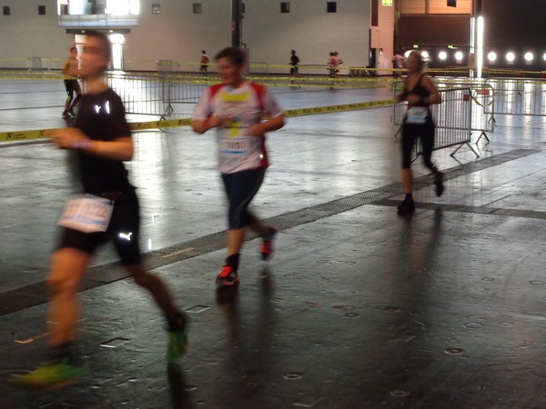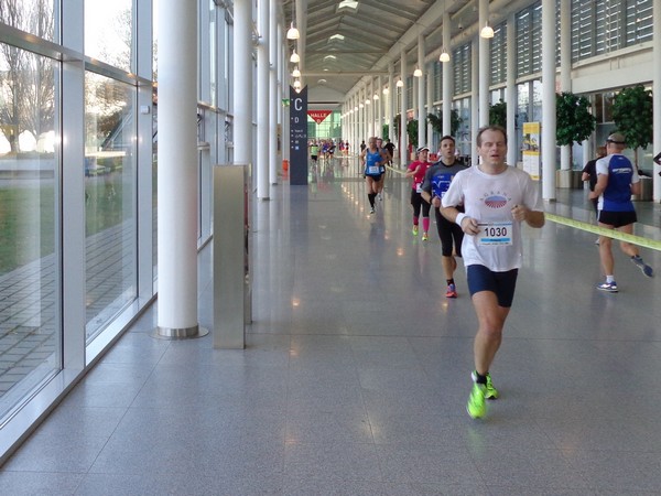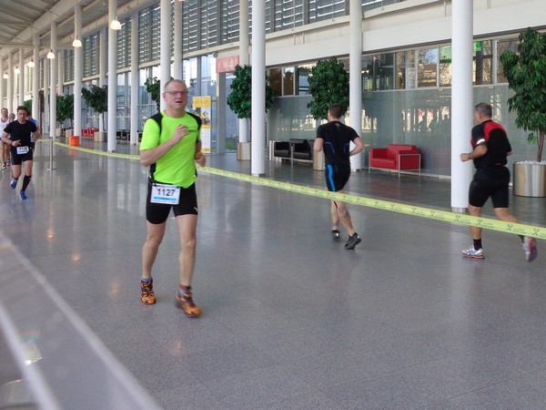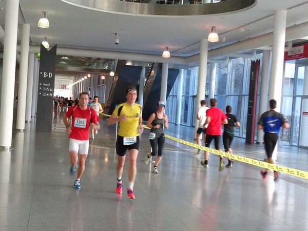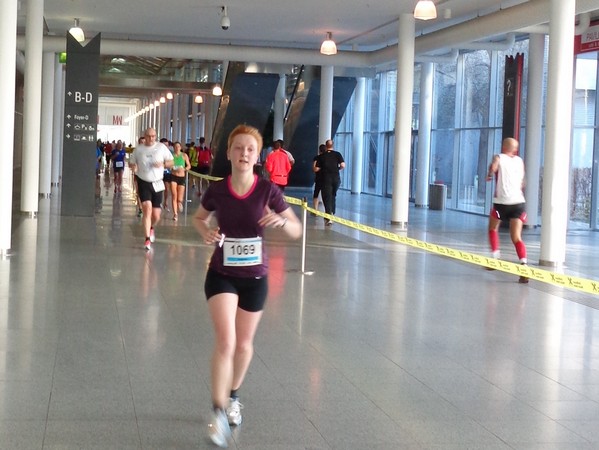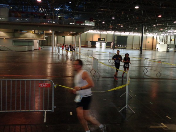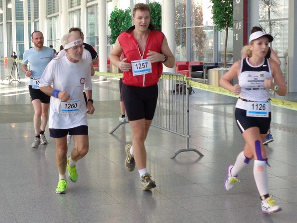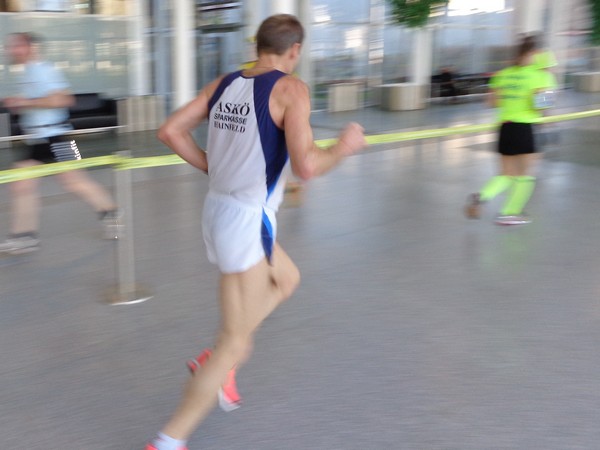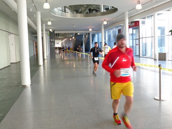 Kaum langsamer geht es weiter für mich. Dennoch kurz nach Beginn meiner dritten Runde werde ich zum ersten Mal überrundet und das ständige Überrunden wird erst gegen Ende aufhören, wenn die schnellen Läufer im Ziel sind. Ich laufe heute zum ersten Mal mit CEP-Kompressions-Socken auf der Marathondistanz. Wenn man es einmal geschafft hat, sie anzuziehen, spürt man sie gar nicht mehr. Nach etwa 57min habe ich 5 Umläufe absolviert, und somit die Viertelmarathondistanz hinter mir. Im Gang wird großzügig gelüftet und mir wird richtig kalt, schließlich war von 15 Grad die Rede, ich laufe kurz/kurz und bin verschwitzt. Bald werden aber die meisten Fenster wieder geschlossen. Die Luft war vorher schon ausgezeichnet, die Hallen haben ein enormes Luftvolumen. Es gibt keinen Kantinenbetrieb, somit keinen Kochdunst, rauchen ist sowieso verboten.