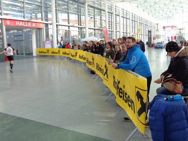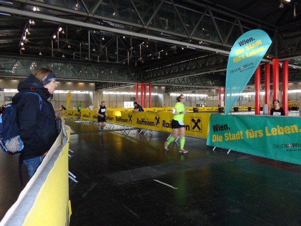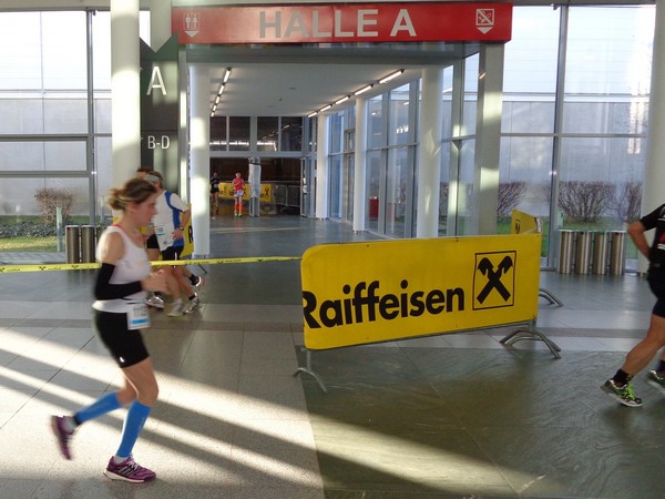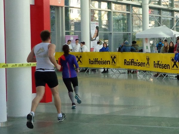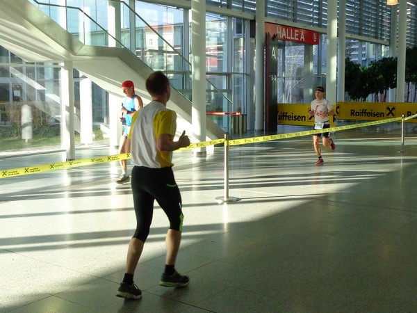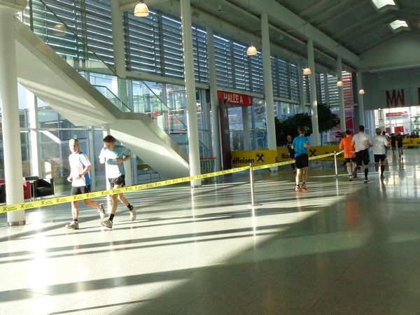 Fand hier am Messegelände die Marathonmesse des diesjährigen Vienna-City-Marathons statt, geht diesmal gleich der ganze Marathon über die Bühne. Kein Wind, kein Regen oder Schnee, keine Höhenmeter. Nur wohltemperierte Hallen und ein langer, von Licht durchfluteter Verbindungsgang, den man pro Runde hin und her läuft. Alle 2,11km kommt man an der einzigen Labestelle vorbei. Es gibt Bananen, Wasser und Iso zu trinken.