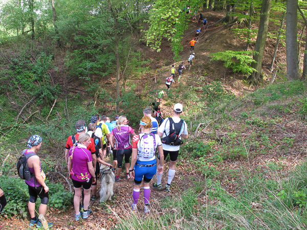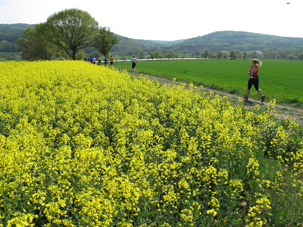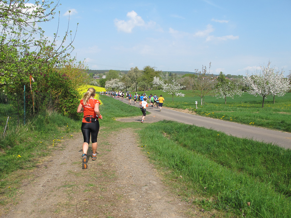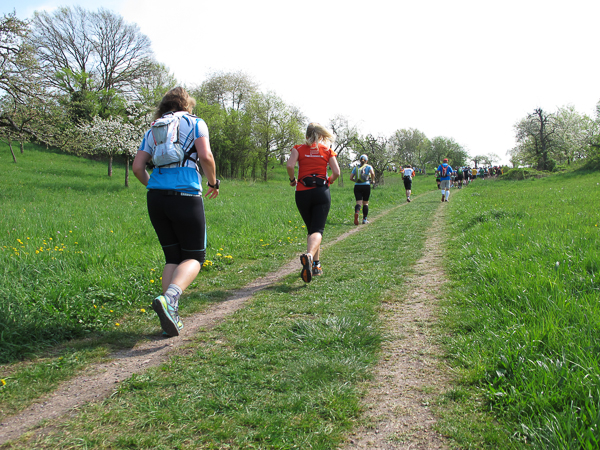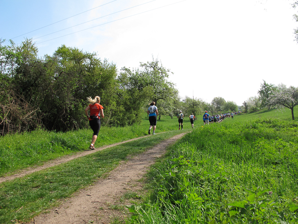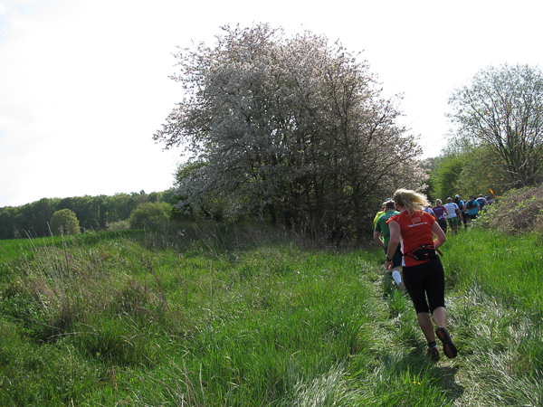 Das Hahnenkammrennen ist gestartet, die Ambitionierten sind schnell weit voraus, meine extrem ehrgeizige Tempoambition habe ich gestern Abend verworfen. Also laufe ich heute in aller Gemütlichkeit dem Hauptfeld über Wiesengelände genüsslich hinterher. Wintersportler werden bei dem Wort „Hahnenkamm“ gleich an das Skirennen in Österreich denken. Hier jedoch handelt es sich um einen Höhenzug in Mittelfranken. Er ist Ausläufer des Frankenjura, der das Nördlinger Ries vom Altmühltal trennt.