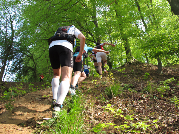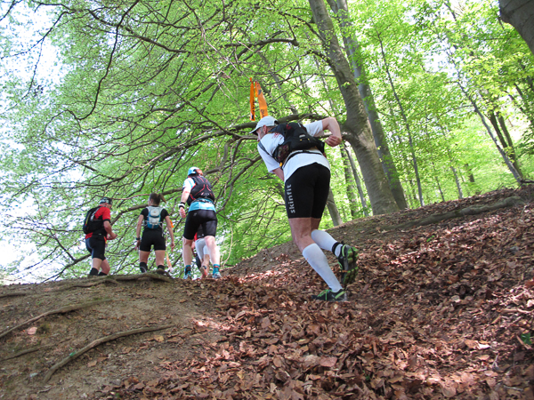 Rechtszeitig haben er und Plan B es geschafft, die Strecke für uns festzulegen vorzubereiten. Das gut eingespielte und erfahrene Team markierte bereits in aller Früh die Trails mit Schildern, Trassierbändern, leuchtenden Fähnchen und Richtungspfeilen aus Kreidespray. So gibt es auch kein Klagen von Naturschützern. Schließlich soll sich niemand verlaufen oder verletzen. Blaue Flecken und Kratzer sind hingegen fast nicht zu vermeiden und gehören irgendwie dazu. Kaum verlassen wir den Startort Alzenau schon beginnt der nicht ganz mühelose Aufstieg.