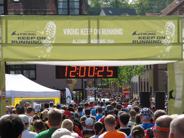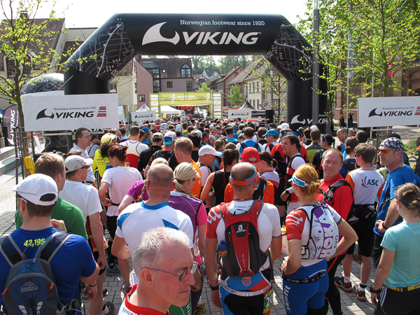Die Gesamtführenden rasen gemeinsam aus der ersten Startreihe los, die Masse der Trail-Läufer strömt hinterher begleitet von zwölf Schlägen der barocken katholischen Stadtkirche. Dem verrückten Läufer-Volk, mit den klangvollen Teamnamen wie Frankenwaldinferno, Alpenbummler, Lebkuchen und Allerlei, folgten am Ende nur noch die offiziellen Schlussläufer Helmut, Michael und ich. Die Schaulustigen kommentieren und applaudieren. Der Held ist weg, endlich herrscht Mittagsruhe in Alzenau.