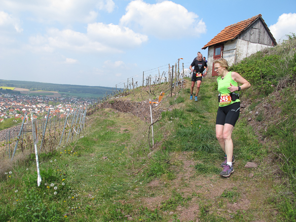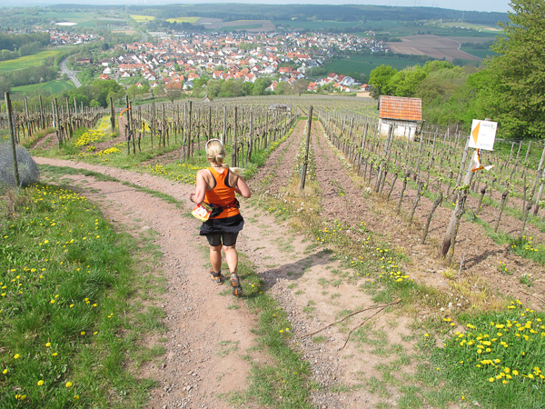 Kurz danach sehe ich auf exponierter Lage die unter Denkmalschutz stehenden Weinberge des Michelbacher Apostelbergs. Riesling Spätlese aus alten Reben gedeiht hier zwischen den Trockenmauern. Viele bunte Läuferpunkte gleichen einer Weinbergwanderung. Dann wird auch für mich der Weinberg steiler und steiler, die Waden dicker und dicker, das Erlebnis zwischen den alten Trockenmauern zu laufen wird größer und größer.