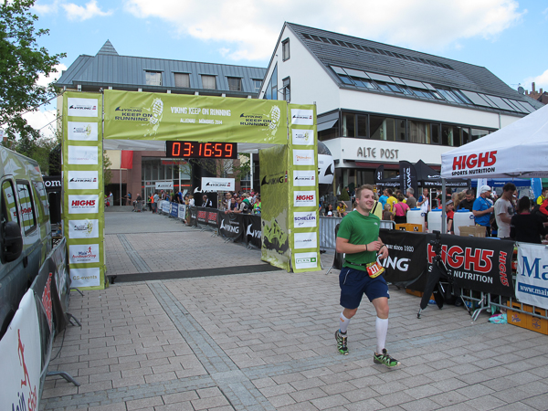 So weit laufe ich heute nicht mehr. Etwa vier Kilometer und schon tauchen die jetzt bereits bekannten Umrisse der Burg in Alzenau auf. Jetzt noch einmal Zähne zusammenbeißen und Tempo steigern. Sven, der Stammmoderator von Plan B, begrüßt ausnahmslos jeden im Ziel.