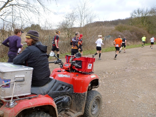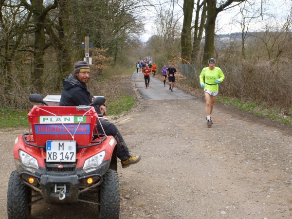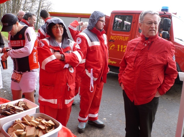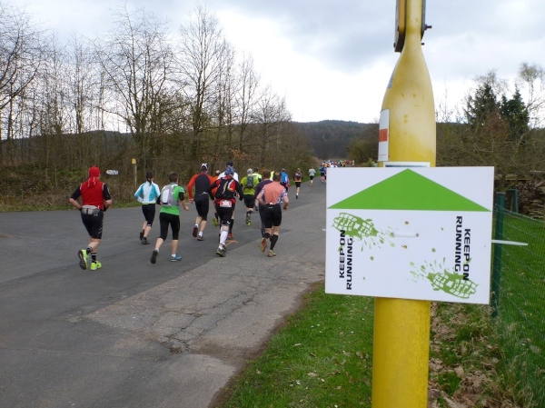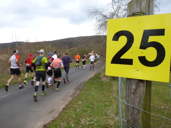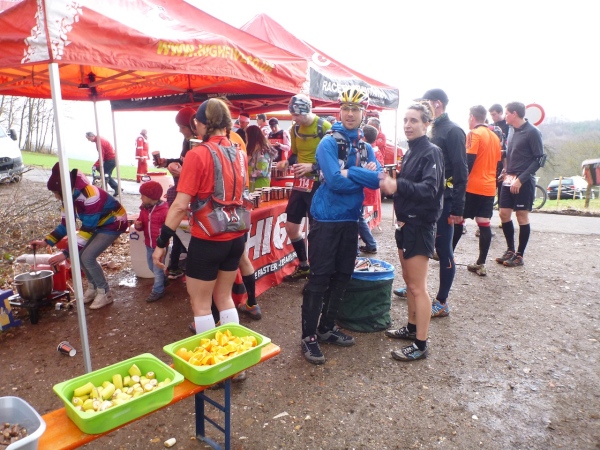 Eine knappe Stunde Laufzeit brauchen wir bis zur ersten Verpflegungsstelle, die oberhalb von Hemsbach eingerichtet ist. Orangen, Bananen, Schokolade, Brot, Kuchen, Gurken, Tomaten, Traubenzucker, Wasser, Iso, Cola, die Auswahl ist reichhaltig. Aber man sollte gut zugreifen, denn mit einer Tankstellendichte wie in einer Großstadt ist hier nicht zu rechnen.