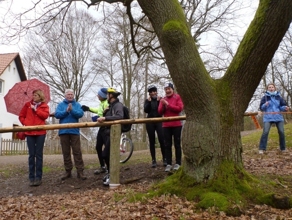 Unterhalb des Turms weist ein Schild auf einen Barfußpfad hin, der nach Möglichkeit mit geschlossenen Augen begangen werden sollte. Das wäre jetzt was für uns. Am Berggasthof Hahnenkamm haben sich sogar ein paar Radsportler und Wanderer eingefunden und feuern uns an. Aber keine Angst, bis jetzt kannst du fast jeden mit Handschlag begrüßen.