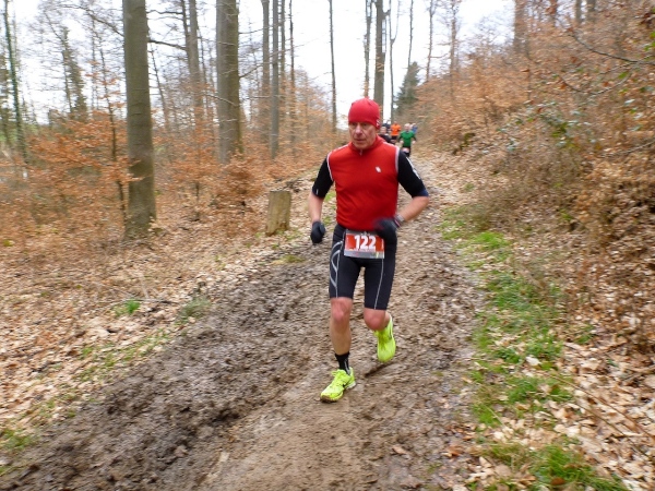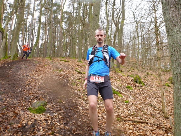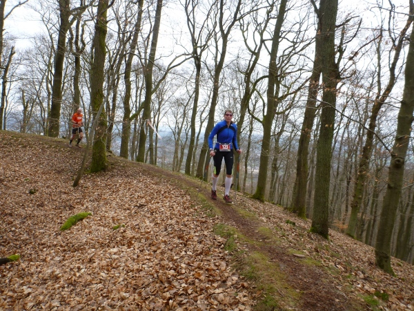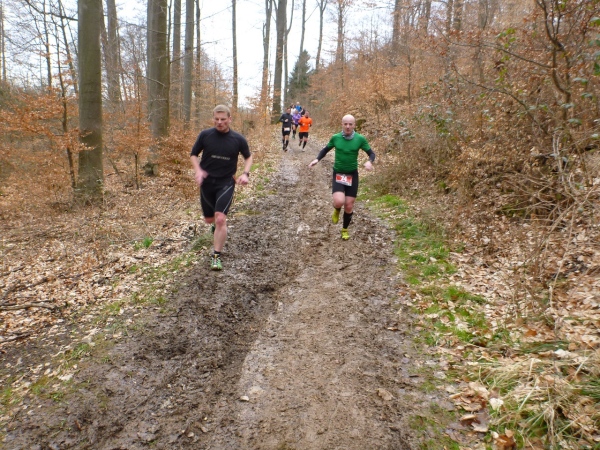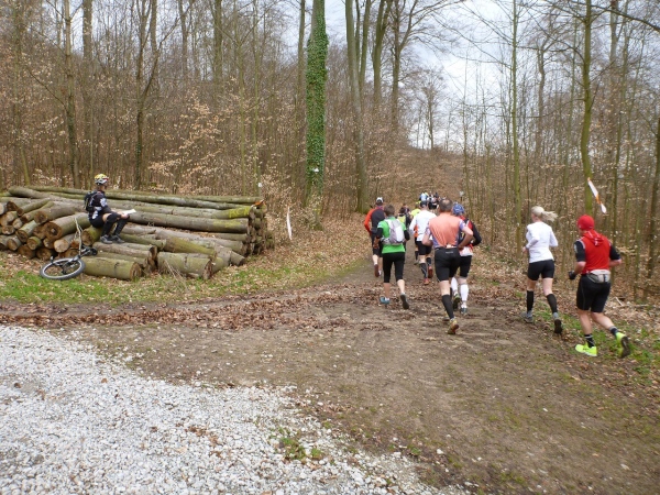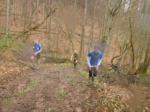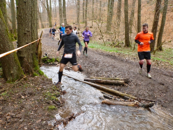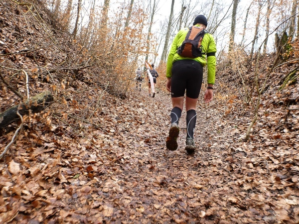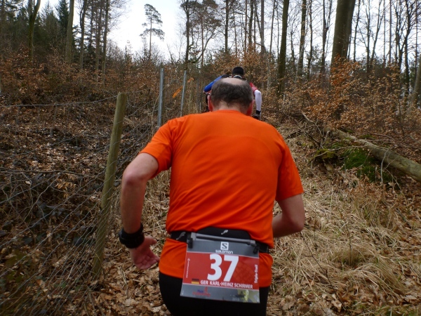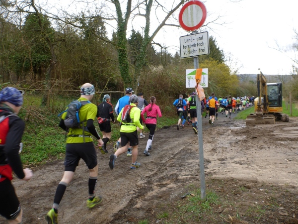 Nach rund fünf Kilometer Laufstrecke haben wir immerhin schon rund 200 der positiven Höhenmeter geschafft. Und es ist sehr abwechslungsreich: Trails, wo du kurzzeitig nicht überholen kannst, ein Sprung über einen Bach, einige tiefe morastige Stellen, Hohlwege, Stiche. Die Oberschenkel maulen schon jetzt. Man merkt‘s: Die Disziplin heißt Trailrunning, nicht Straßenlauf.