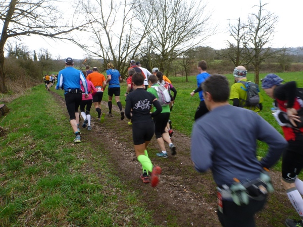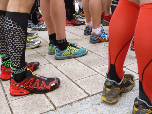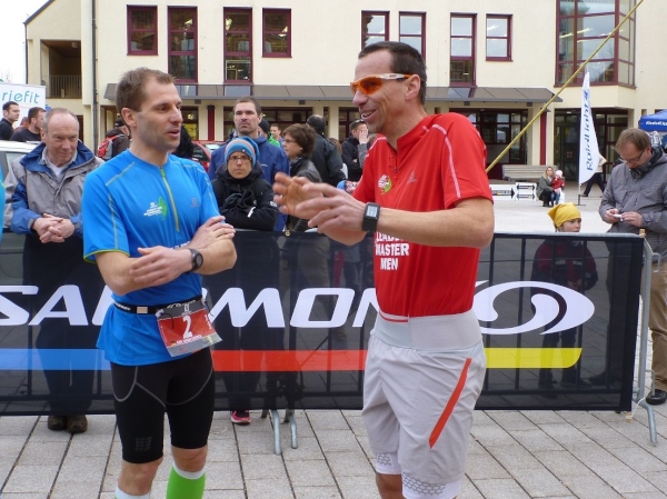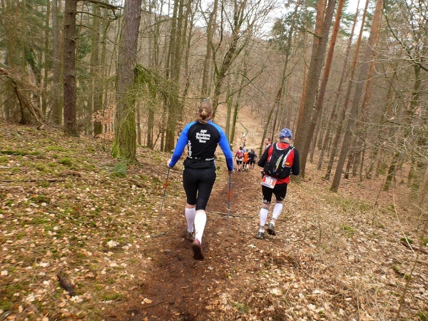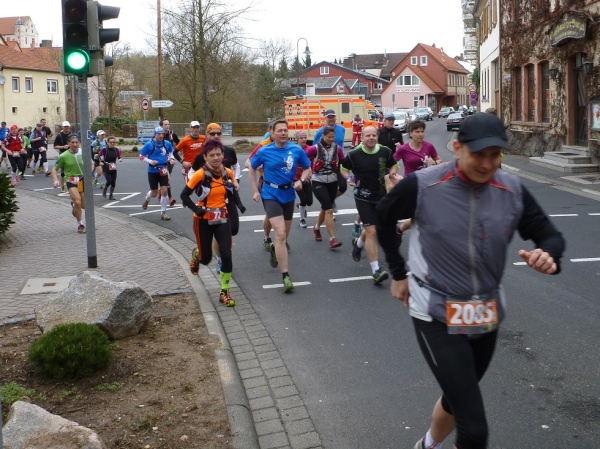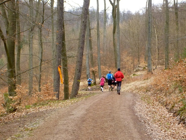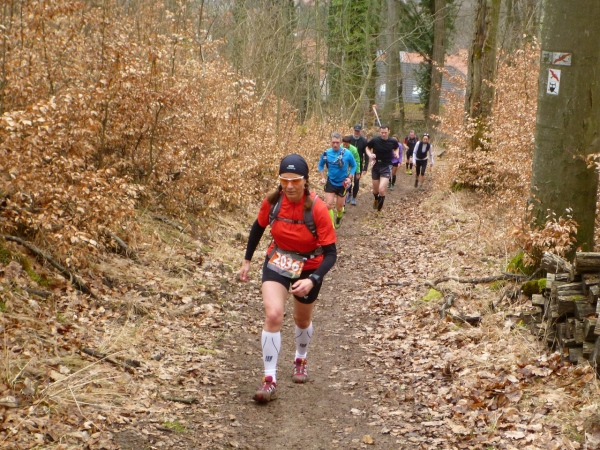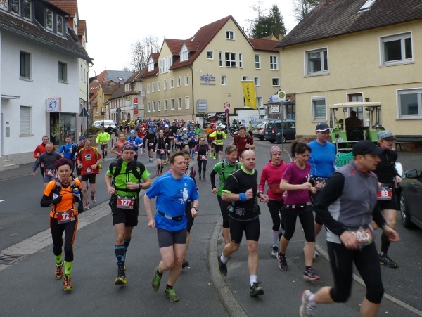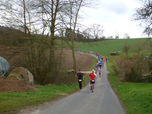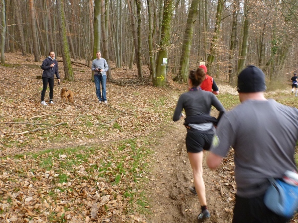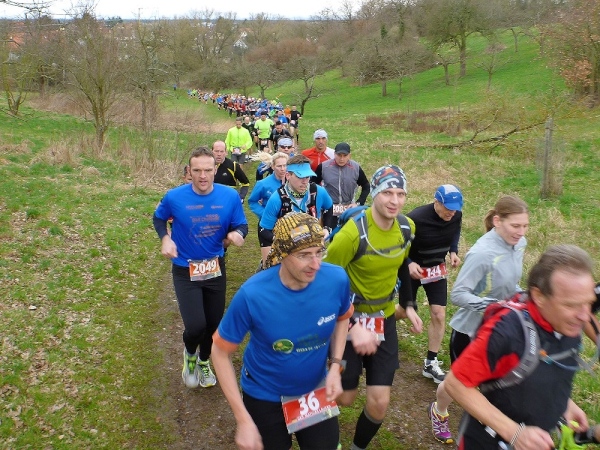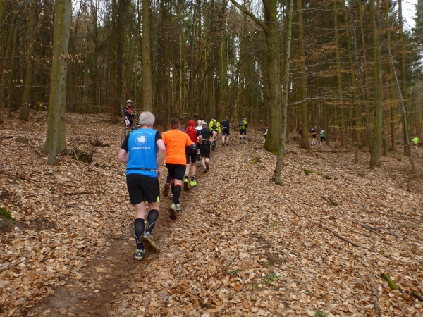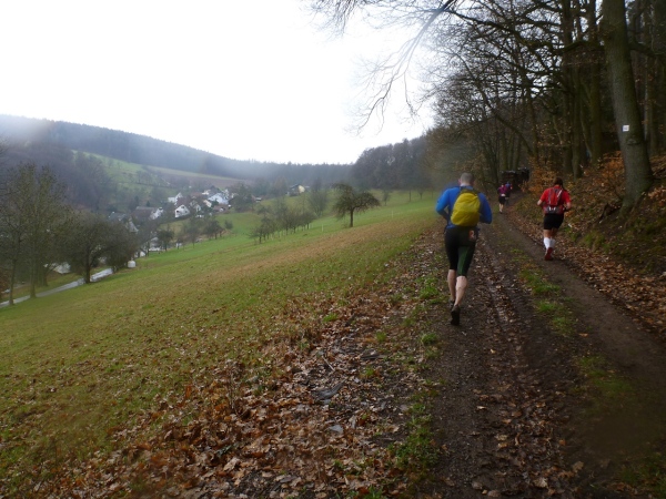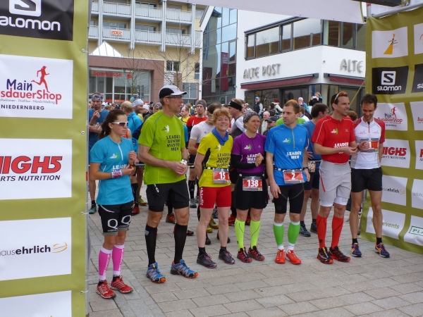 Auf die Sekunde pünktlich werden wir am Marktplatz losgelassen. Nur zwei Minuten geht es im Stadtgebiet auf Asphalt dahin, dann verlassen wir das gepflegte Laufterrain. Zuerst noch Schotterweg, dann erwartet uns der erste zarte Grasanstieg, der dann von einem Gefälle abgelöst wird. Die 956 Höhenmeter auf den 27,3 Kilometern wollen bezwungen werden.