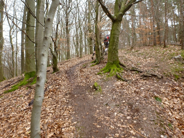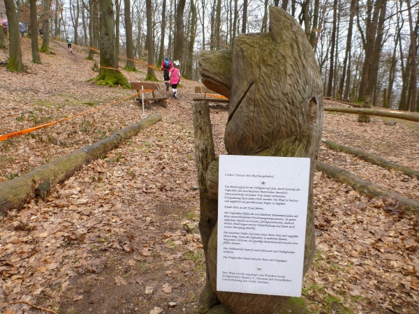 Am Schanzenkopf (nach vielen weiteren Höhenmetern) belaufen wir den Ringwall auf fast der ganzen Länge. Der Wall ist mit etwa acht Meter Breite und zwei Meter Tiefe deutlich zu sehen. Es dürfte sich entweder um eine frühere Verteidigungsanlage oder um Reste einer Burg handeln. Der Schanzenkopf (343 Meter hoch) fällt auf drei Seiten steil ab. Richtung Osten, weniger schroff zur Elbernhöhe verlassen wir den Ringwall.