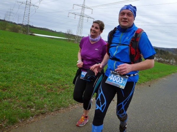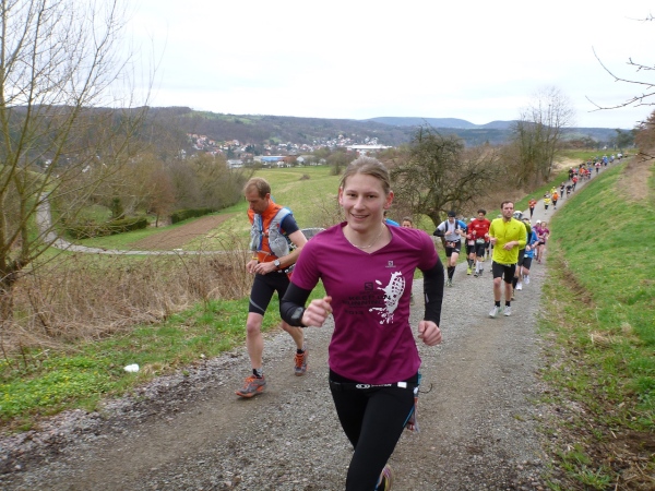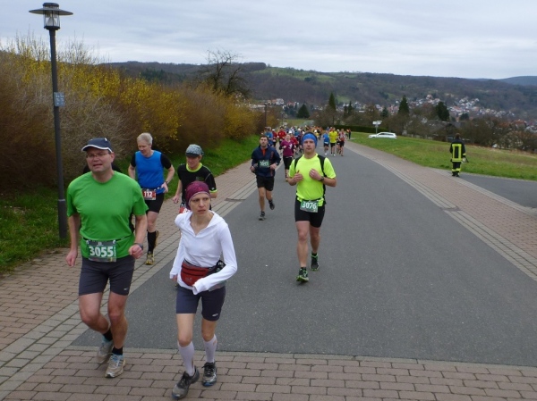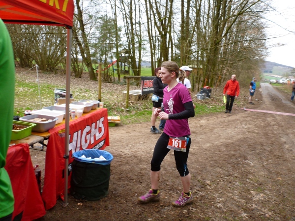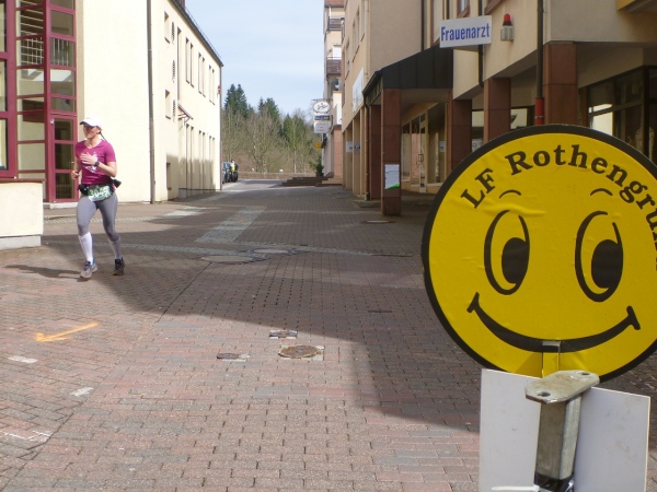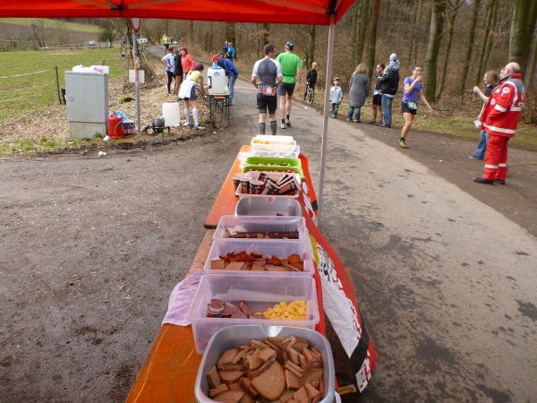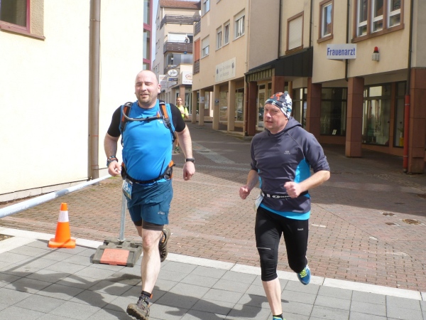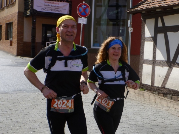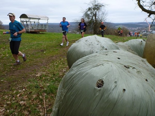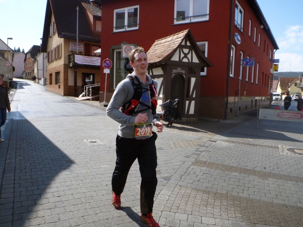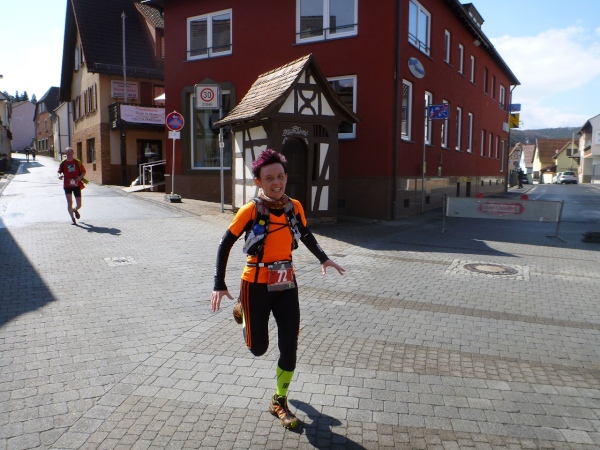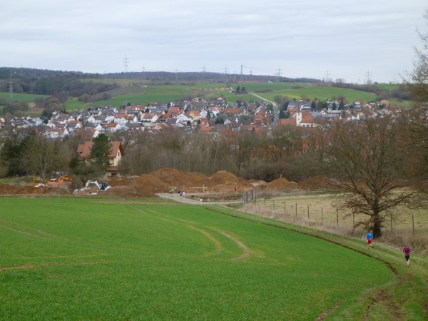 An der ersten Verpflegungsstelle, die am gleichen Ort wie am Vortag aufgebaut ist, wird die Zeit genommen und dann ausgiebig gefuttert. Die Wegführung bleibt ländlich-rustikal mit Steinen, Wurzeln und engen Wegen. Wir sind knapp eine Stunde im Rennen, dann zeigt ein Schild die restliche Weglänge von 15 Kilometer an. Die folgenden gut zwei Kilometer sind gefällig, vom Höhenprofil her. Aber nicht so die Wegführung, denn unmittelbar nach dem Waldrand geht es steil einen Wiesenweg Richtung Michelstadt hinunter. Und bevor wir in den Ort laufen, gibt es eine Baustellenbesichtigung. Ein kleines Baugebiet wird da erschlossen und auf dem Schotteruntergrund rennen wir weiter. Am Ende können die Känguruhs unter uns noch mit einem eleganten Satz über die Baustellenabsperrung hüpfen. Die Lahmen zwängen sich dann seitlich durch.