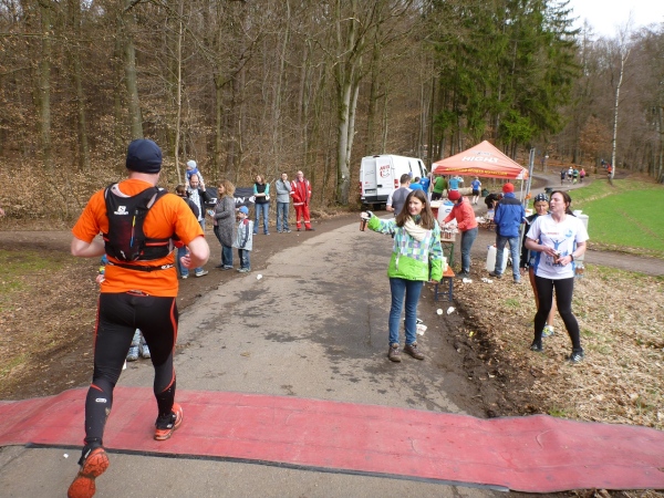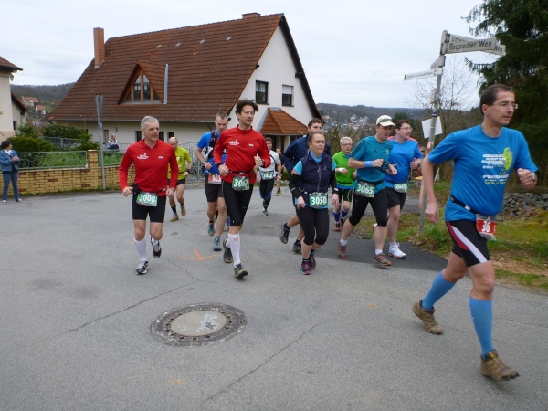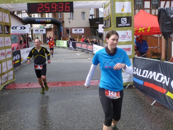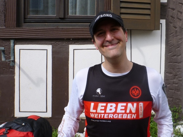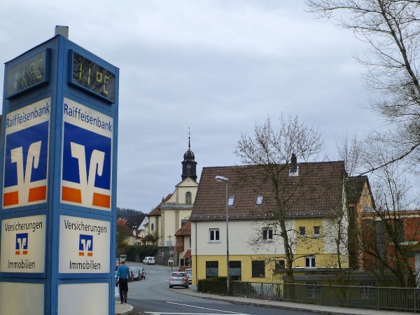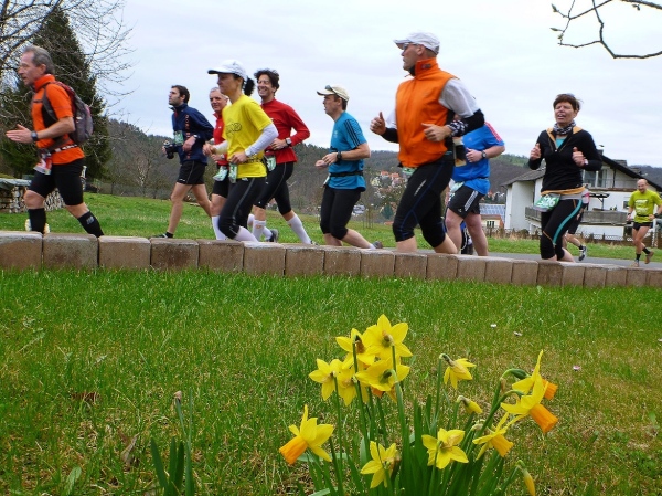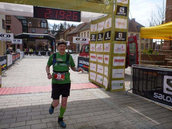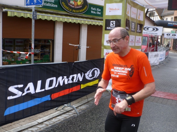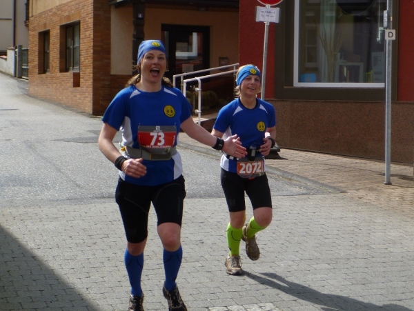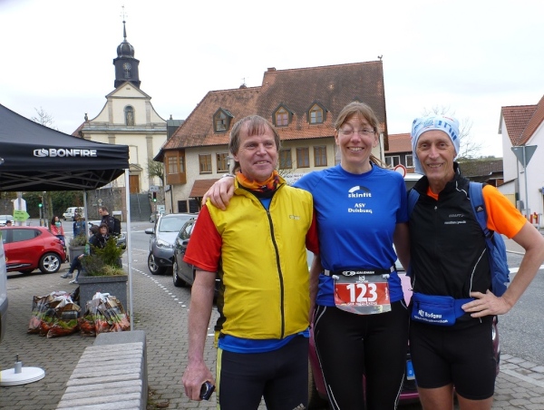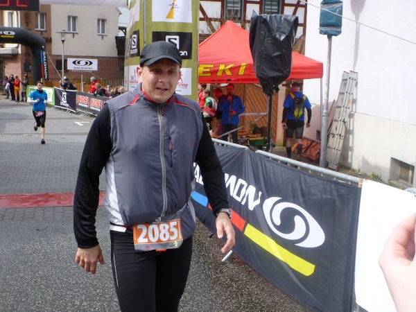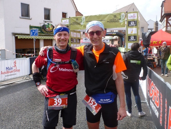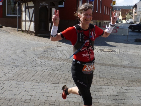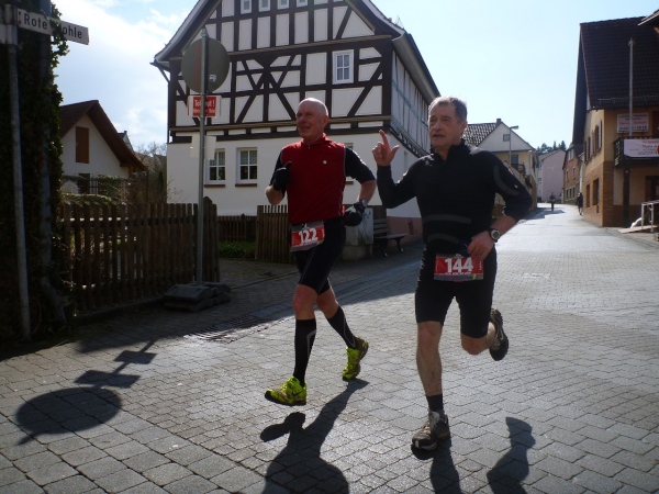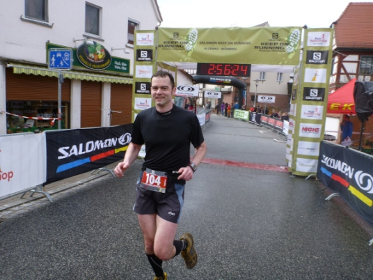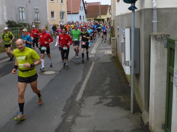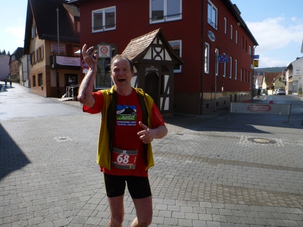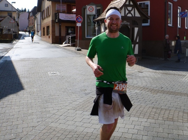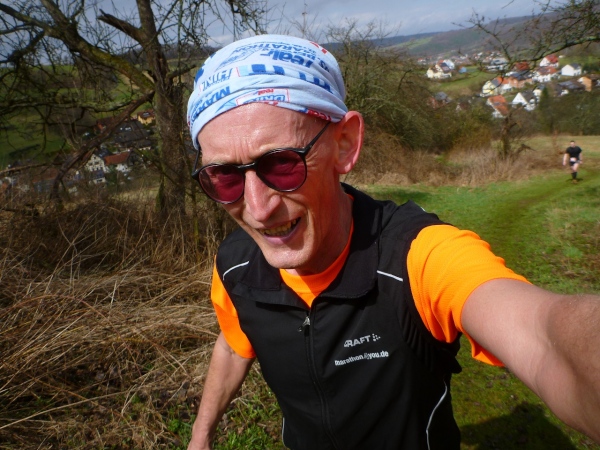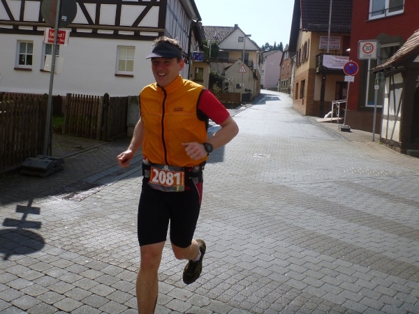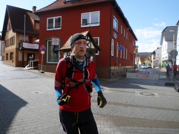 Dann scheint die Plagerei ein Ende zu haben, denn ich erblicke Kilometerschild eins und sehe auch schon die Kirche in Mömbris ganz nahe. In fünf Minuten wartet Bier und Brotzeit, so mein Gedanke. Stutzig werde ich dann nach einigen Augenblicken, als ich rechts oberhalb von mir zuerst einen, dann mehrere im Galopp dahin springen sehe. Gleich danach geht es nochmals 20 Höhenmeter hinauf. Und nach langen 14 Laufminuten (!) kommt in Mömbris das Zieltransparent in Sicht. Kein einziger Kilometer, eher zwei, oder eine Meile Luftlinie ist der Abstand des angesprochenen Kilometerschildes zum Ziel. Doch dann ist Etappe zwei Geschichte.
