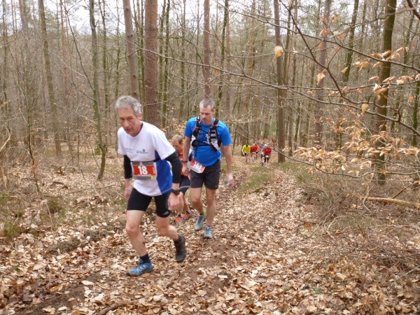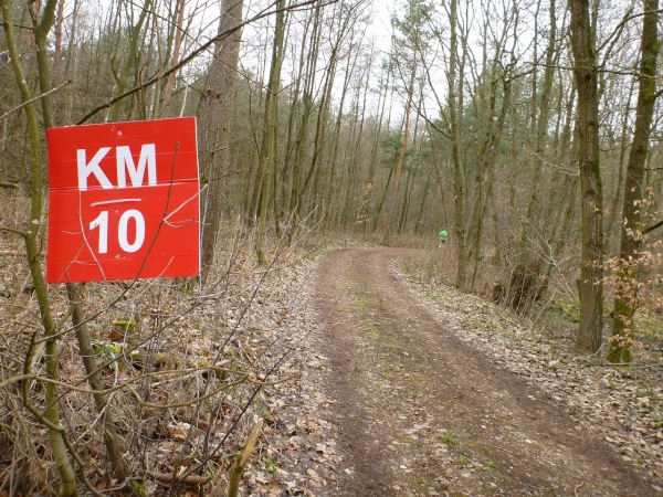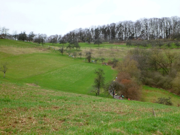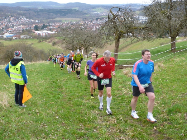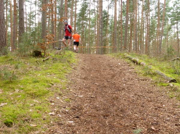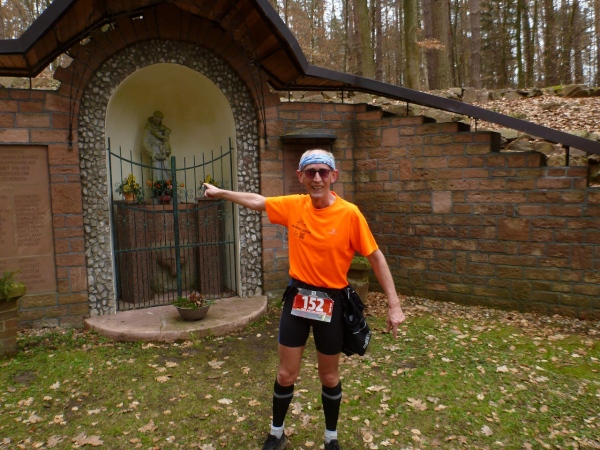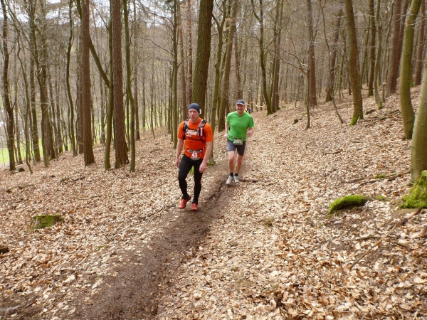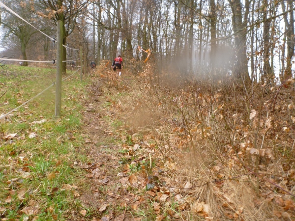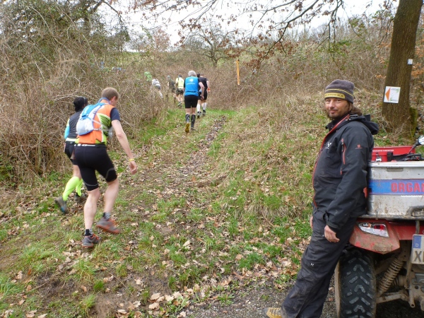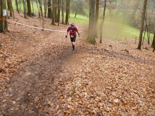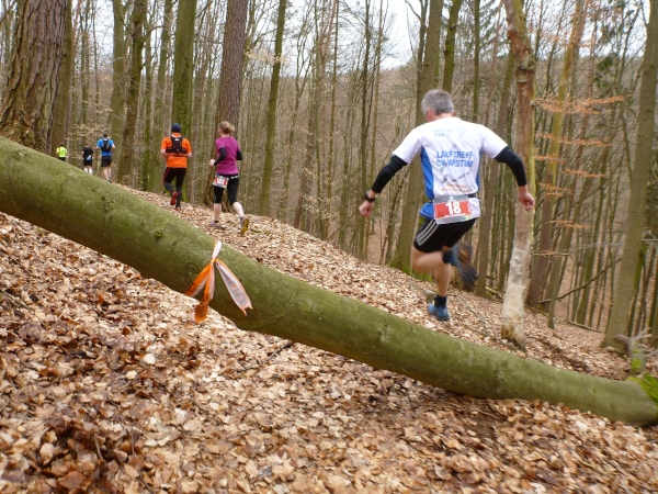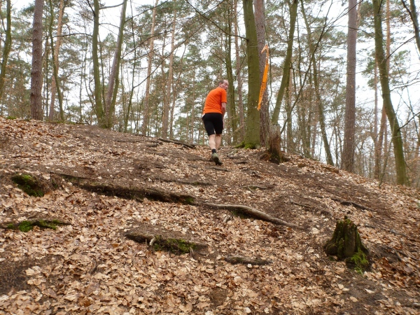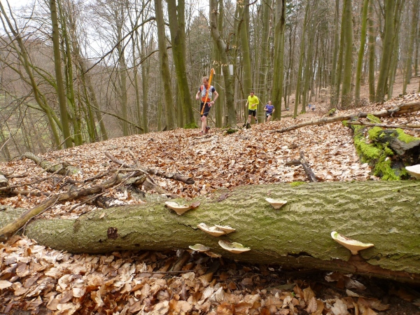 Recht kurzweilig führt uns der Kurs südlich an Hemsbach vorbei zum Hahnenkamm. Trotz meiner maladen Oberschenkelmuskulatur macht es viel Spaß, über Baumstämme zu springen, sich durch das tiefe Laub zu wühlen oder einen tiefen Graben zu überwinden. Dann überqueren wir eine Teerstraße, wo vier Zuschauer eifrig applaudieren, darunter der zweite Bürgermeister Robert Brückner.