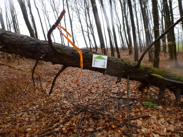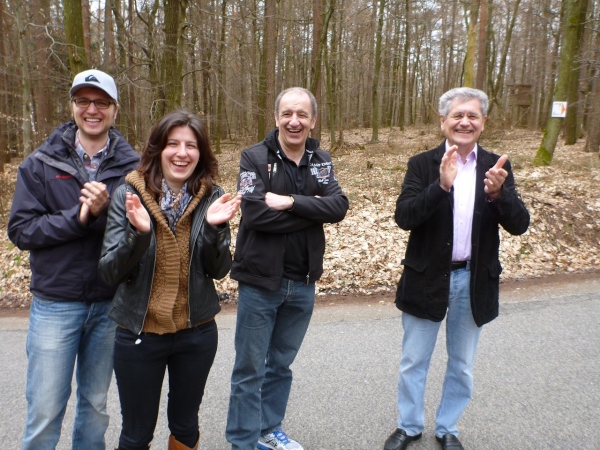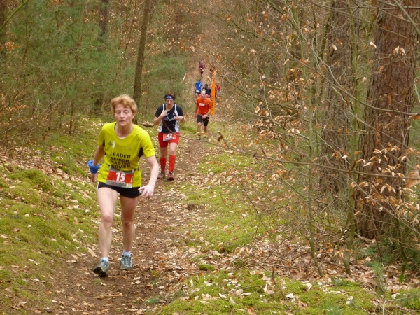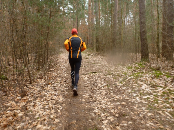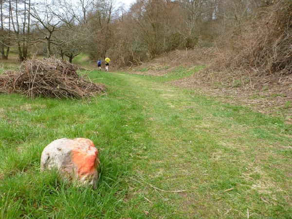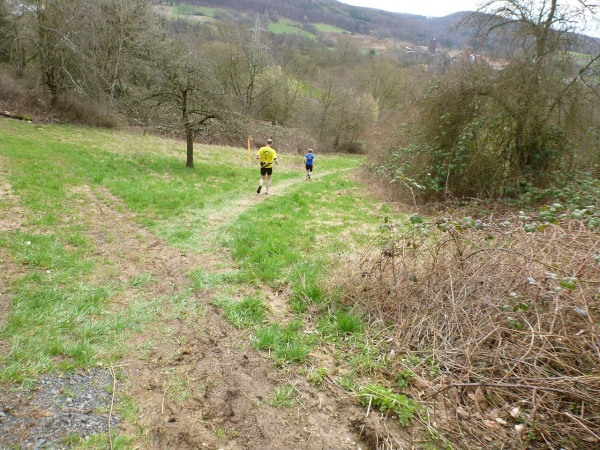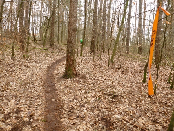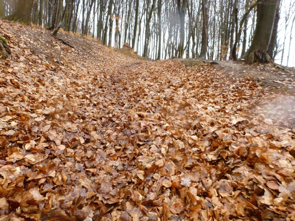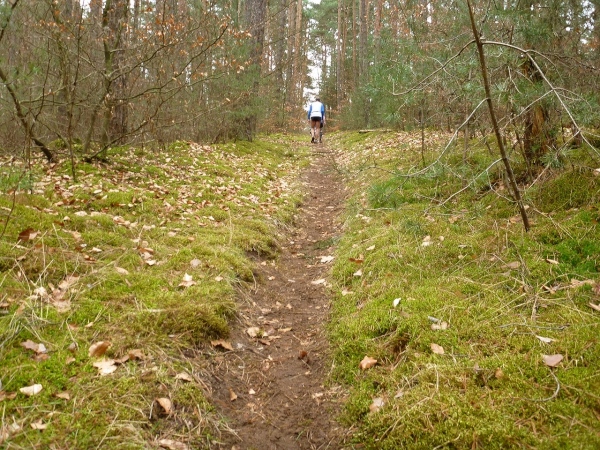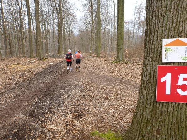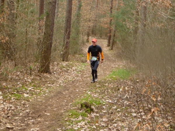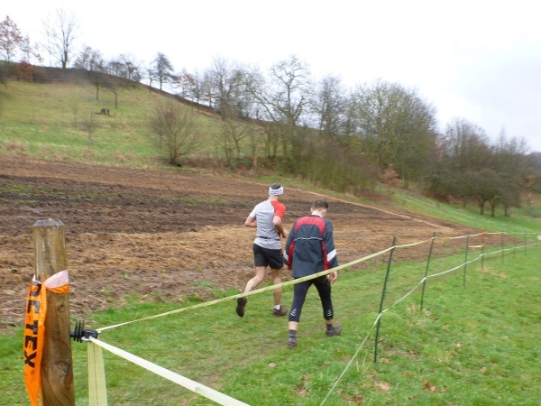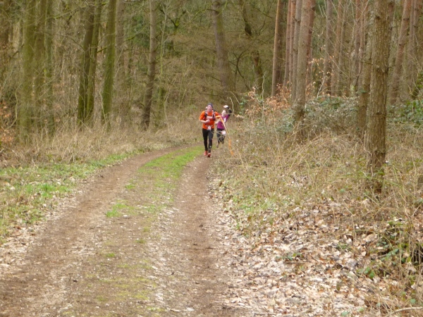 Recht kurzweilig führt uns der Kurs südlich an Hemsbach vorbei zum Hahnenkamm. Trotz meiner maladen Oberschenkelmuskulatur macht es viel Spaß, über Baumstämme zu springen, sich durch das tiefe Laub zu wühlen oder einen tiefen Graben zu überwinden. Dann überqueren wir eine Teerstraße, wo vier Zuschauer eifrig applaudieren, darunter der zweite Bürgermeister Robert Brückner.