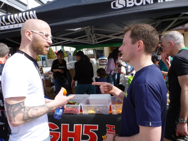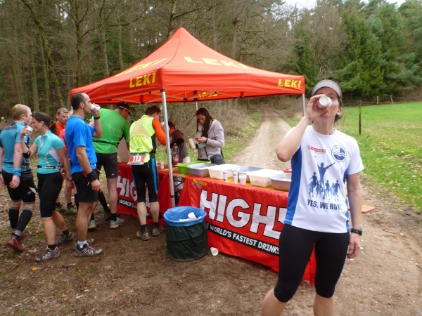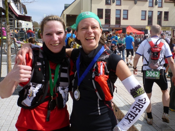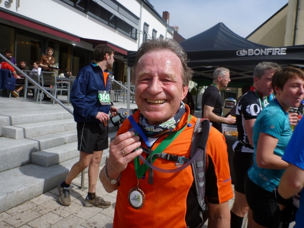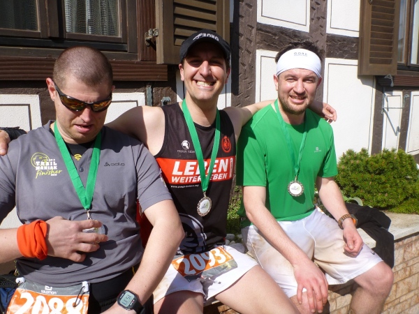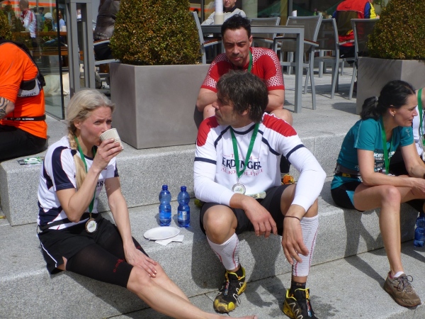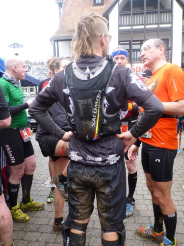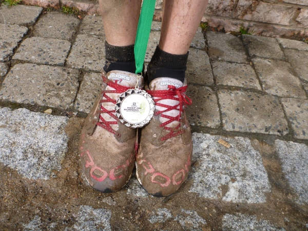 Die Finisher, gleich ob nur dieser Tag oder die ganze Serie gebucht wurde, sind glücklich, ohne große Schrammen das Ziel erreicht zu haben. Aber der Schuhputz aller ist unter aller Sau, die Bilder beweisen es. Der Verpflegungsbereich ist prima bestückt wie am Vortag, lediglich das alk-freie Bier geht zur Neige.