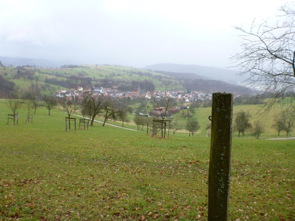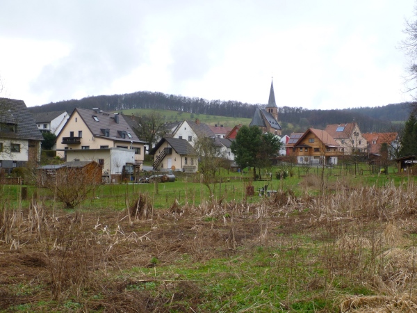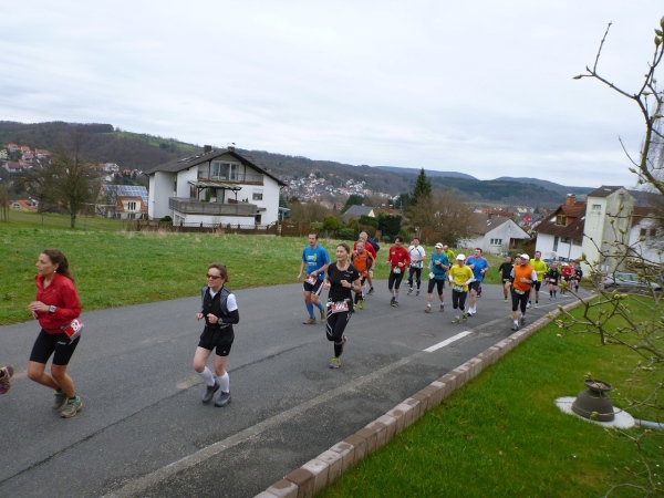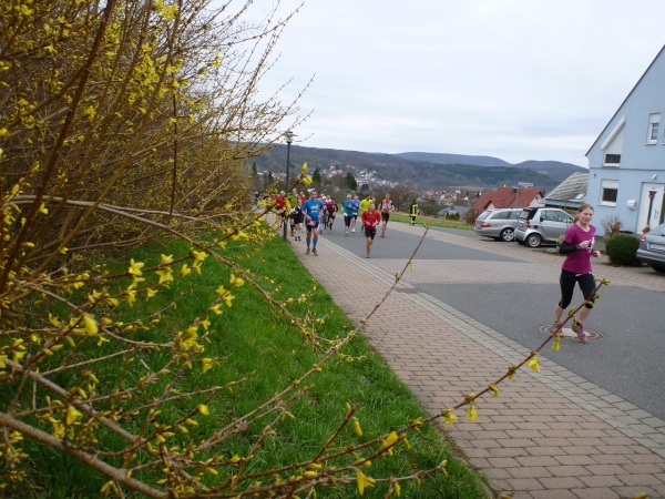 Nicht mal 500 Meter geht es flach im Ortskern dahin, danach biegen wir auf eine steile Gasse ein, die uns mit mehr als 10 Prozent Anstieg nach oben führt. Nach zehn Minuten Wettkampfzeit zwingt uns eine noch stärkere Steigung auf Grasuntergrund bereits zum Gehen. Und dann sehen wir auf dem Bauersberg und haben eine schöne Aussicht in den Kahlgrund.