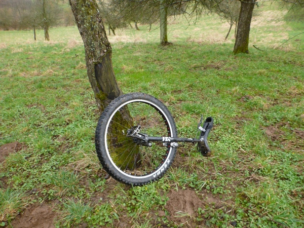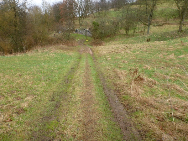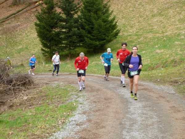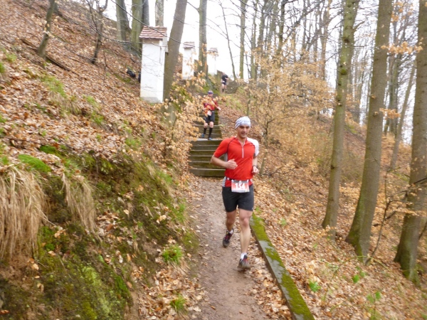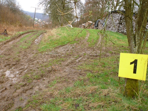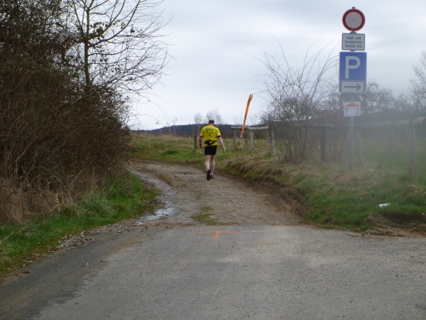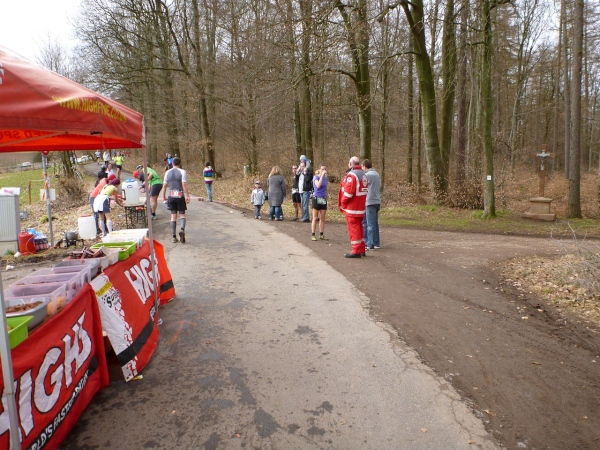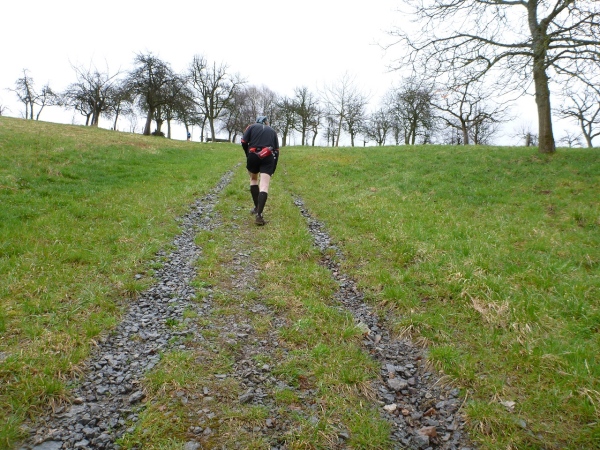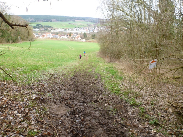 Unser Kurs wendet sich nun nach Südwesten in Richtung der ersten V-Stelle. Wir müssen wieder hinauf. Ein, zwei ganz kurze Teerstücke sind darunter, dann geht es wieder auf Wiesen- und Waldwegen steil bergauf. Dann wird Petrus inkontinent, denn plötzlich regnet‘s. Der Untergrund wird schnell entsprechend schmierig. Der Unterschied zwischen Trailschuhe und Straßenlaufschuhe wird nun deutlich. Sogar gut profilierte Straßentreter kommen nun an ihre Haftungsgrenze. Hinter einem Baum liegen zwei riesige Knochen. Nicht jeder hat diese gesehen. Eine Sau hat keine so große Knochen, wahrscheinlich hat ein Hund ein Mammut ausgegraben und die Reste für Hungerszeiten hinterlegt. Kurz später die bekannte Tankstelle. Aufpassen, nicht dass man nach der Trinkpause noch mal die Turmrunde macht oder in eine Endlosschleife gerät.