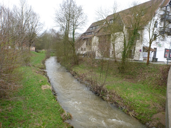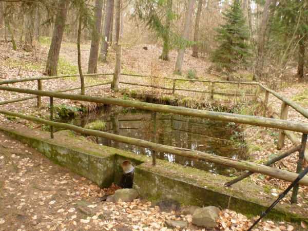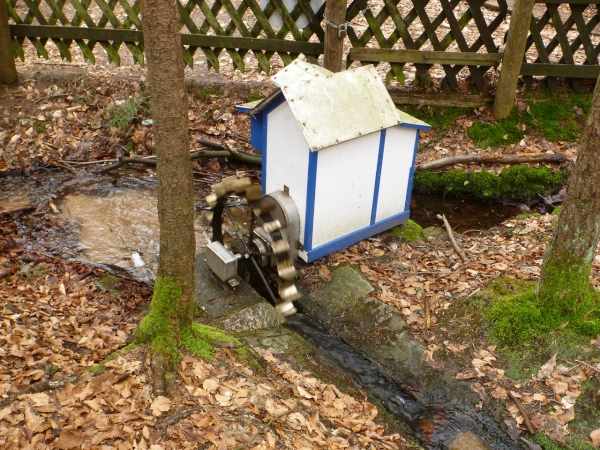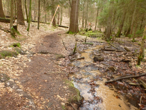 Nach 15 Minuten führt uns ein kleiner Abhang mit Wurzeln an den Einfallsgraben, ein gut zwei Kilometer langes Bächchen, heran, wo ein kleines Wasserrad der Klappermühle angetrieben wird. Das Gescheppere ist eine Zeitlang noch zu hören. Mittlerweile kann ich auf einige Trailer auflaufen und diese überholen, darunter ist die Führende der Senior Master Frauen.