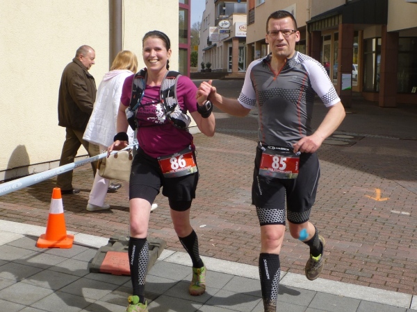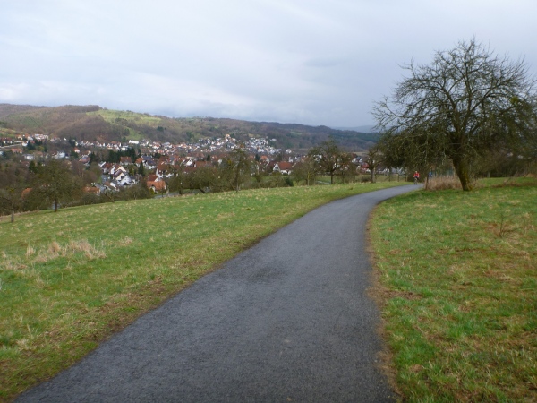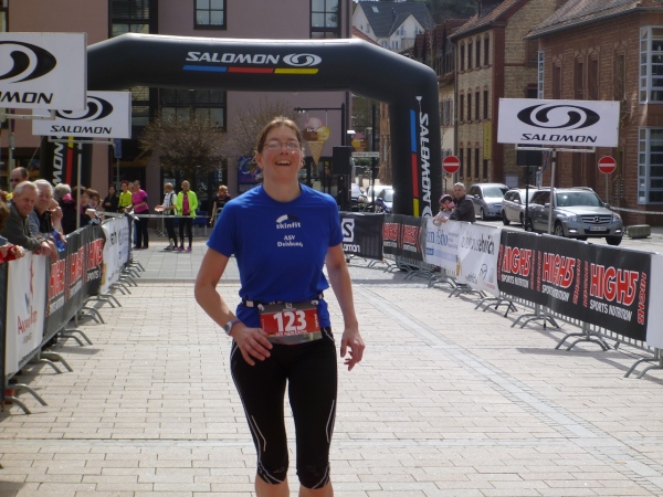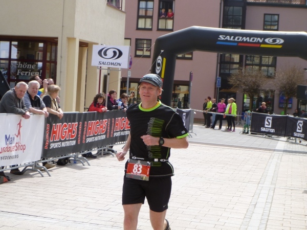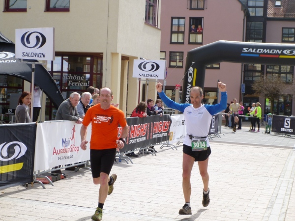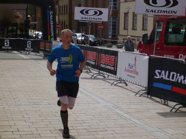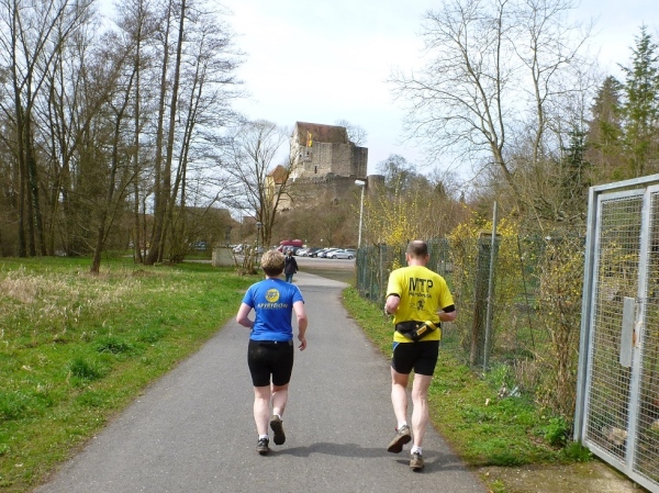 Das letzte Wegstück führt uns nun in die Streuobstwieden östlich von „Alsenah“. Die Stadtpfarrkirche ist schon eine ganze Weile zu sehen. Über einen Wiesenabhang schleiche ich dann hinunter zum Kahlradweg, auf dem nun einige Radler unterwegs sind. Die Wolken haben sich mittlerweile verzogen, die Temperatur ist in Richtung 20 Grad gestiegen. Die letzten Meter verlaufen auf Asphalt neben dem Parkplatz unterhalb der Burg. Nach einer Kurve renne ich in die Innenstadt und dann grinsend bis hinter die Ohren durch das Ziel. Damit ist der letzte Schritt bei diesem Wochenendprogramm getan.