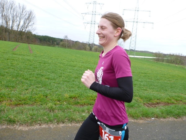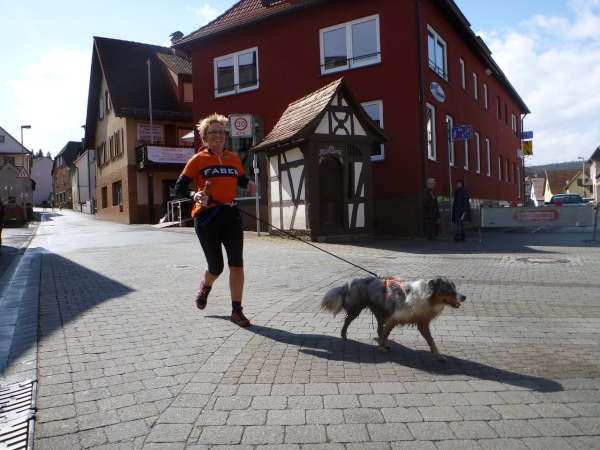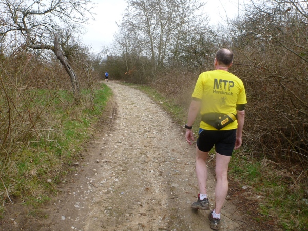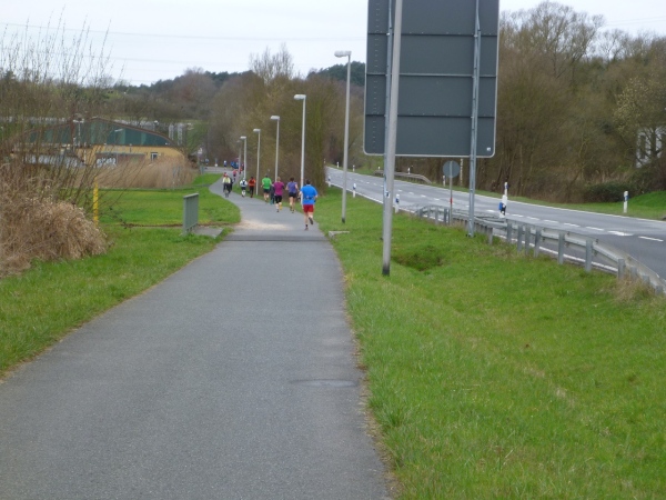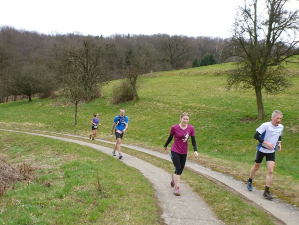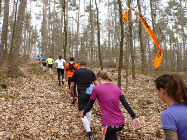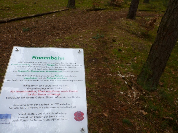 In der Mühlmark hat Alzenau vor ein paar Jahren eine Finnenbahn errichtet. Und da für uns jede Abwechslung willkommen ist, hat man den Kurs auf die Finnenbahn umgeleitet. Der weiche Boden aus Hackschnitzeln und Sägespänen ist eine Wohltat für die Füße, auch wenn das Vorwärtskommen Kraft kostet.