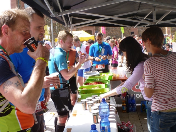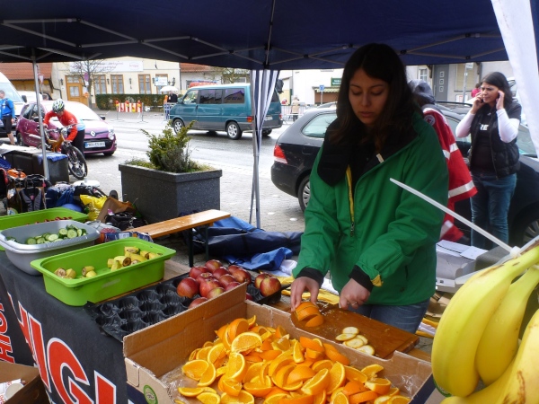 Kinder überreichen die Medaillen, Erwachsene die Gutscheine für Kaffee und Kuchen. An der Zielverpflegung mangelt es an nichts: Wasser, Cola, Orangen, Bananen, Nüsse, Tomaten, Gurken. Doch, ein Verbesserungsvorschlag: Bayerisches Manna fehlt.