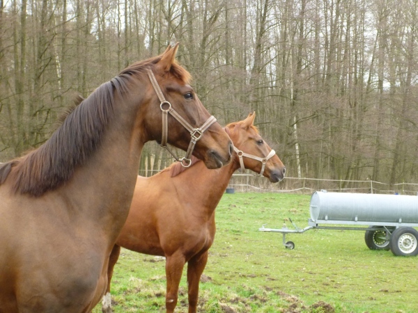 Kurz vor dem Waldrand der Mühlmark sind an einem Pferch zwei Pferde zu sehen, die sich mit einem Pfeifen anlocken lassen. Die Steigungen sind jetzt deutlich leichter im Vergleich zum Hahnenkamm, doch flach ist es beileibe nicht. Immer wieder geht es 30, 50 Höhenmeter nach oben. Bevor wir in dem Waldstück voll verschwinden, können wir an der zweiten und letzten Tankstelle nochmals zugreifen.