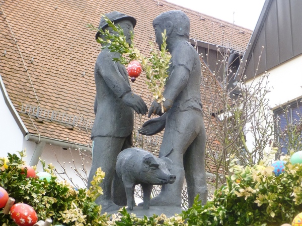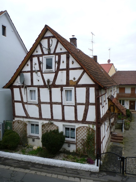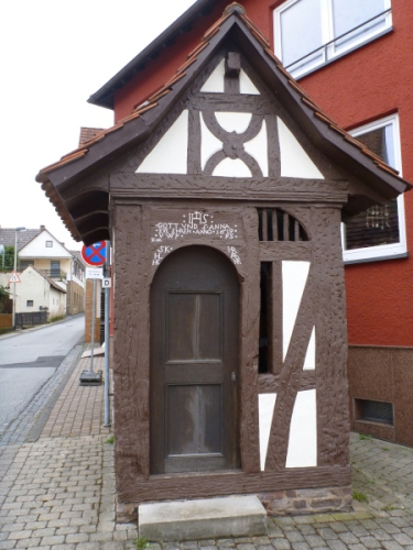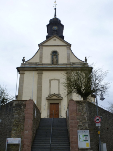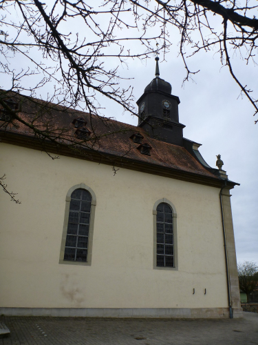 Michelbach ist die Trennlinie zwischen Hahnenkamm und Mühlmark und liegt im unteren Kahlgrund. Hier ist die nördlichste Weinanbaustelle Bayerns. Die Pfarrkiche St. Laurenzius haben wir schon frühzeitig gesehen, sie wurde 1777 auf den Resten einer früheren Kapelle erbaut. Sehenswert ist auch das barocke Michelbacher Schlösschen, das heute ein Museum beherbergt. Ja, und der Täter kehrt immer an seinen Tatort zurück: Vor Jahren habe ich hier bei einen Feuerwehrlauf mitgemacht. An dem damaligen Start laufen wir jetzt auch vorbei. Ich erinnere mich, dass es damals für meinen Trepperlplatz einen süffigen Boxbeutel gab. Ein wenig langweilig ist der Radweg entlang der Staatsstraße.