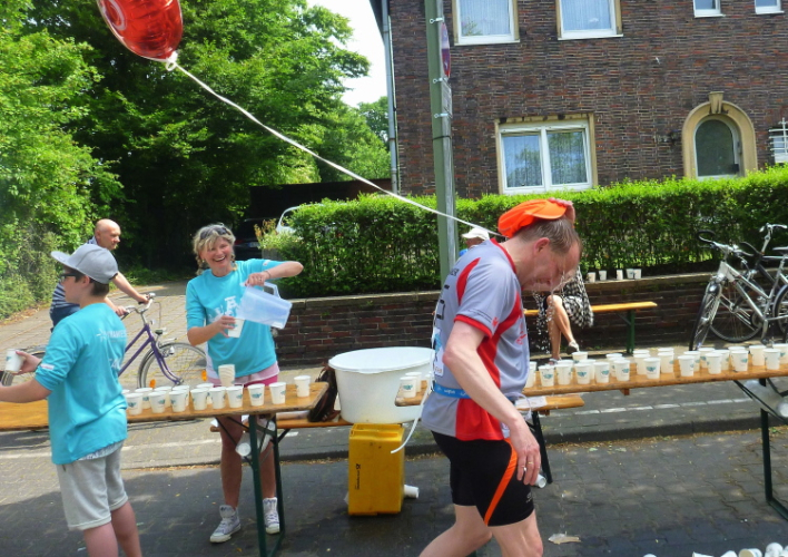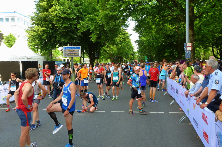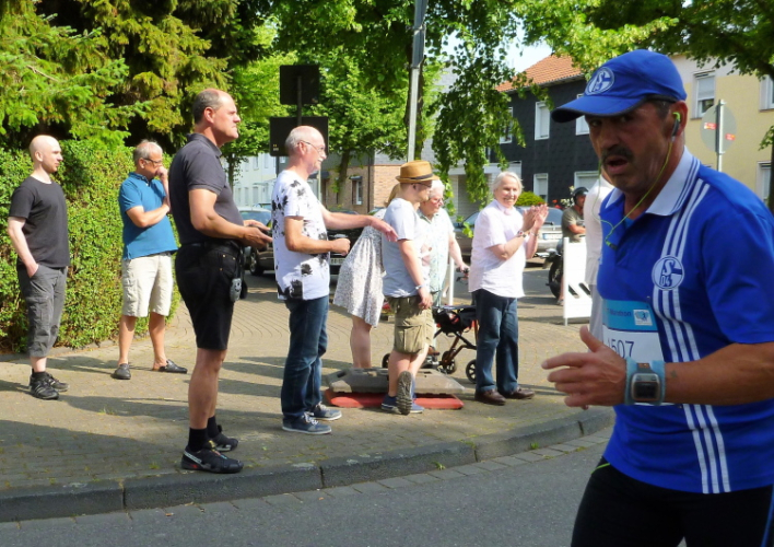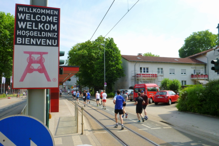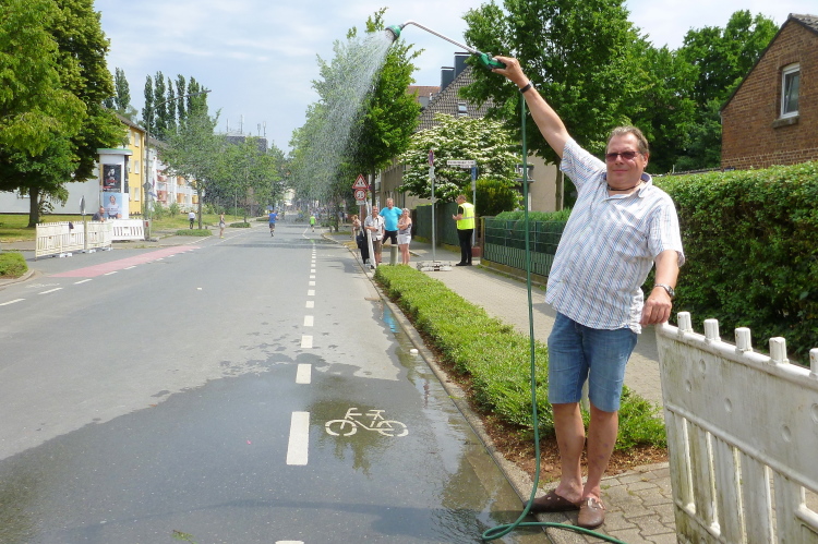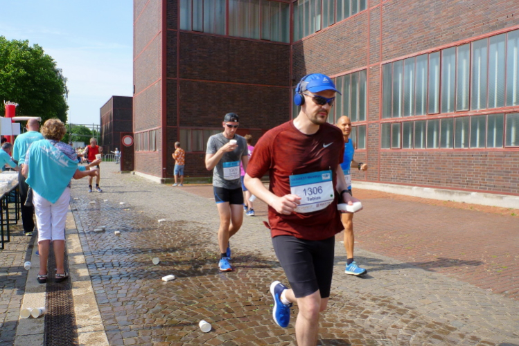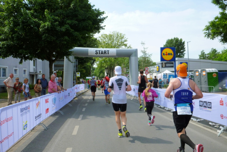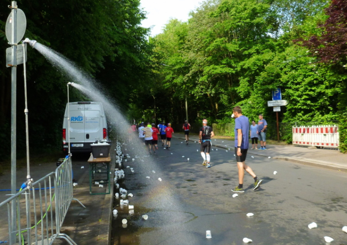 Kilometer drei, die erste V-Stelle wartet mit Wasser, Iso, Apfelschorle, später erhalten wir noch Bananen und Cola. Und was mich erfreut, bereits hier sind laufende Wasserduschen installiert, die ersten Läufer halten schon ihren Kopf unter den Duschkopf. Ich begnüge mich vorerst noch mit einem Wasserschwamm. Der Kurs ist sehr abwechslungsreich, bisher geht es auf breiter Straße, dann ein Wohngebiet, Kinder, die Abklatschen wollen, ein kurzes Waldstück und schwupps, sind wir in Essen angelangt. Die Stadtgrenze habe ich nicht gesehen.