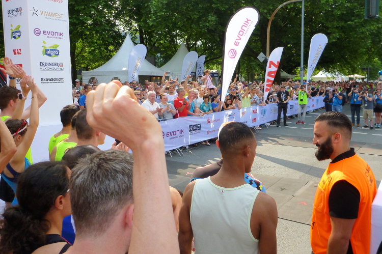 Minuten vor dem eigentlichen Start werden wir in die zwei Marathonboxen gelassen, wobei der schnelle Bereich kontrolliert wird. Es gibt noch letzte Live-Schaltungen nach Bottrop und dann nimmt der Ruhrkohle-Chor mit 70 Mann plus Dirigentin Aufstellung. Die schmettern dann das bekannte „Glück auf, der Steiger kommt“. Bis ins 16. Jahrhundert reicht der Ursprung dieses Liedes zurück. Thema ist natürlich der Bergbau, seine Schätze und die Hoffnung, wieder gesund ans Tageslicht und zurück zu Frau und Familie zu kommen, denn die Bergarbeit ist hart und gefährlich. Ich bekomme Gänsehaut.