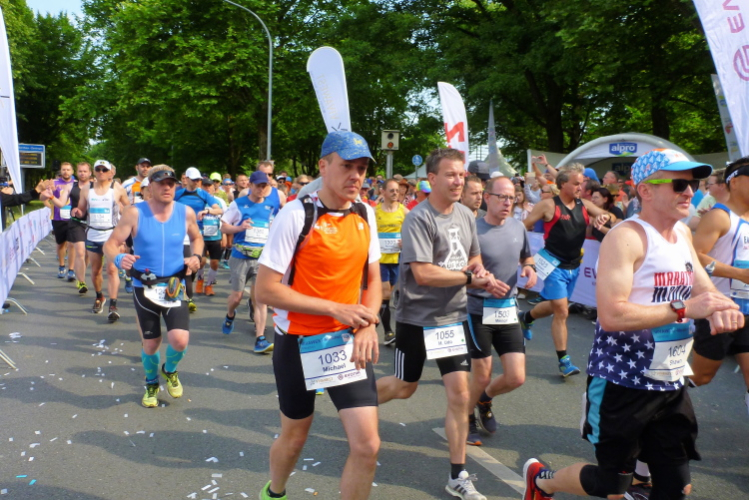 Doch dann geht es mit 20 Minuten Verspätung los. Papierschnipseln werden nach oben geschossen und der Block von 1000 Marathonis macht sich auf den langen Weg. Die Stimmung im Feld und unter den zahlreichen Zuschauern ist prächtig. Es geht die Overwegstraße leicht hinunter und dann unter der Bahnlinie hindurch. Mein erster Eindruck auf der Strecke: Holla, das wird nicht ganz eben zum Ende hin.