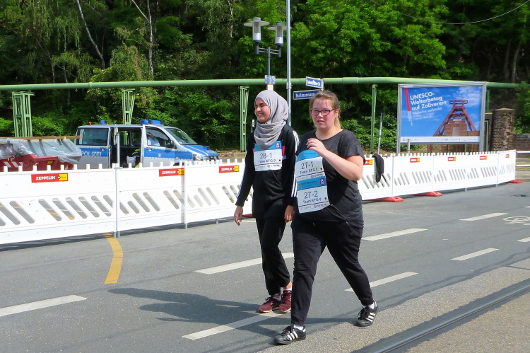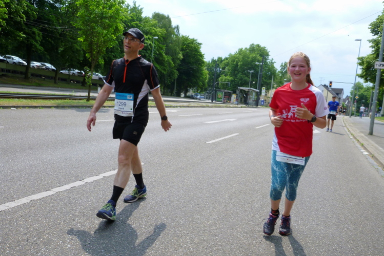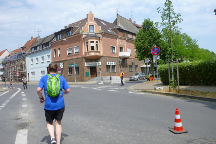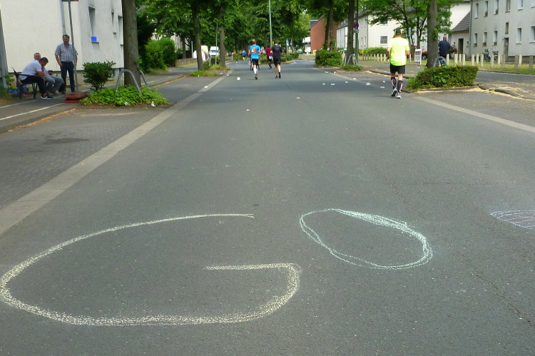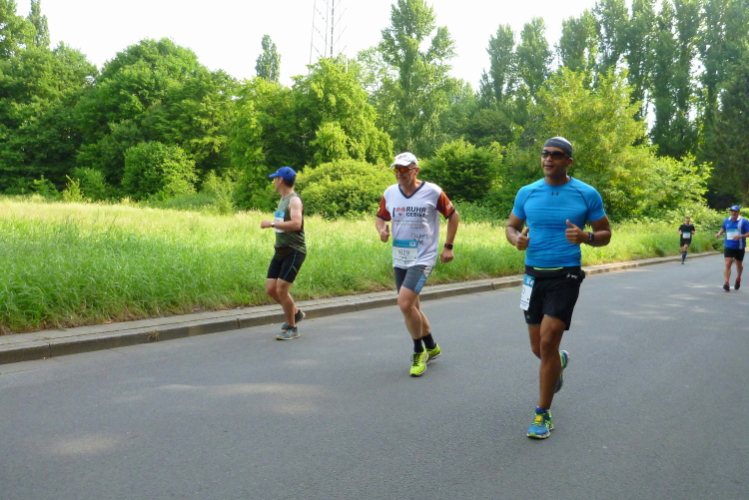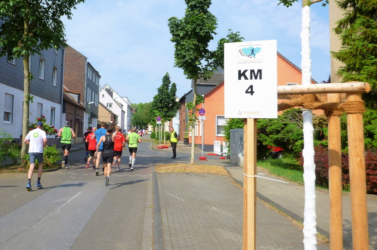 Ein paar Straßenzüge weiter sehe ich dann auf der anderen Seite noch zwei der letzten Schülerstaffeln, wobei zwei der drei Mädels mit Kopftüchern laufen, es sind türkische Schülerinnen. Integration geglückt, sage ich da nur. Nun geht es ein längeres Stücke auf einer ehemaligen Eisenbahntrasse. Links und rechts stehen höhere Bäume, wir Läufer sind nun über jeden Schatten erfreut. Bei Kilometer zehn bin ich eine knappe Stunde unterwegs.