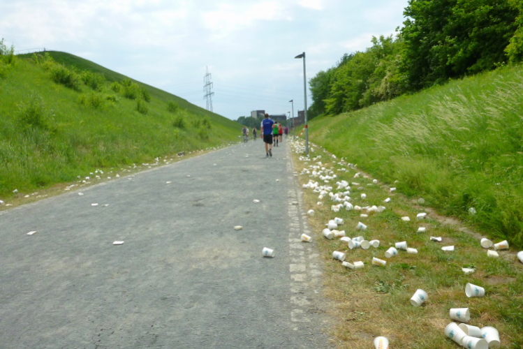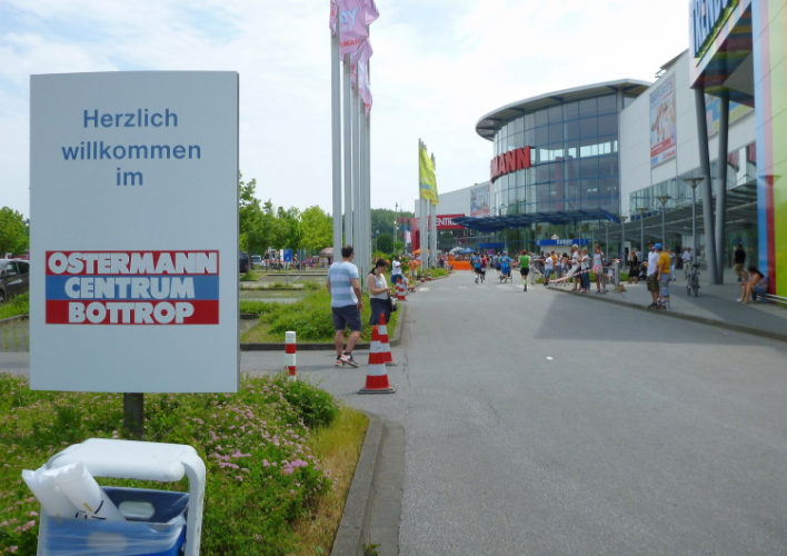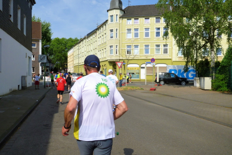 Kilometer 22, der Fanpoint beim Möbelhaus Ostermann. Ein kurzes Stück verläuft die Strecke auf einem Schotterweg, die Sonne brennt auf uns herab. Die vielen Zuschauer helfen uns weiter. Gut 110.000 Einwohner hat die Stadt Bottrop, deren Geschichte bis ins Jahr 1092 zurückgeht. Zuerst laufen wir durch ein Wohngebiet, dann führt wieder ein längeres Stück entlang einer Hauptstraße, wo Schatten Mangelware ist.