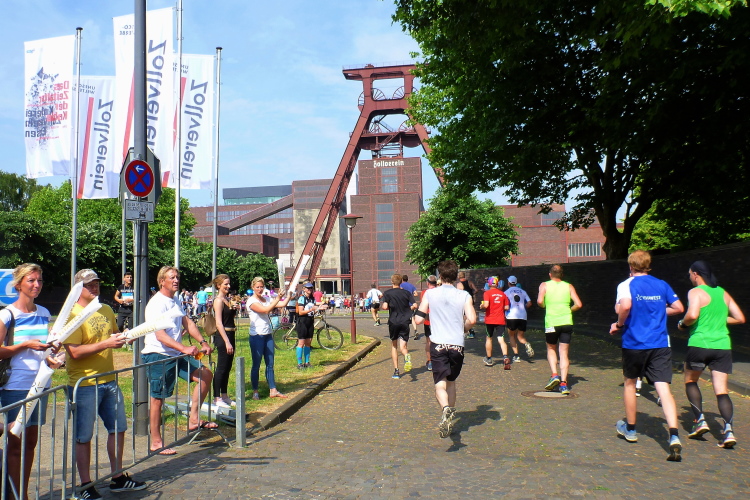 Kilometer 25, wir biegen nun auf das Gelände der Zeche Prosper Haniel II ein. Das Bergwerk ist das letzte aktive Steinkohlen-Bergwerk im Ruhrgebiet. Der Eigentümer RAG will das Bergwerk zu einem unterirdischen Pumpspeicherkraftwerk umbauen. Gut einen Kilometer rennen wir auf dem Betriebsgelände und sehen so eindrucksvoll die Vielzahl der Betriebsbauten. Am Ausgang spielt eine Rockband vor vielen Zuschauern.