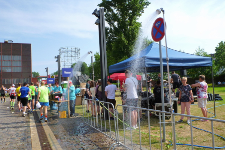 Kilometer 15: An den Duschen muss man sich schon fast anstellen, alle suchen das kühlende Nass. Gleich danach kommt die Trennung. Marathonis müssen links lang, die Halbmarathonläufer werden rechts eingewiesen. Hier ist wieder ein Wechselpunkt der Staffeln. Rechts sehe ich die Zeche Nordstern. Auf dem Rückweg kommen wir hier wieder vorbei.