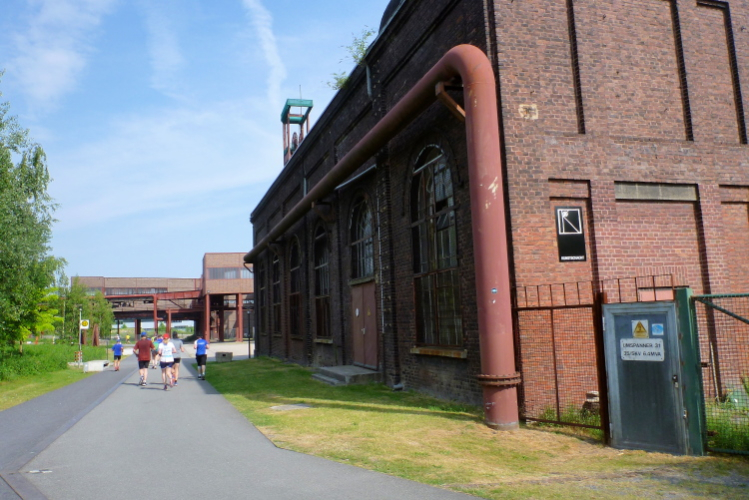Der Kurs biegt von der breiten Straße ab und ich stehe vor der Zeche Zollverein, ein bis 1986 betriebenes Steinkohlebergwerk, das heute ein Industrie- und Architekturdenkmal ist. Seit 2001 zählt die große Anlage zum Welterbe der UNESCO. Immer wieder habe ich in den letzten Jahren meiner Lauferei gehofft, diese Sehenswürdigkeit laufend zu erkunden und nun ist es soweit. Ich laufe hinein, der Fotoapparat ist einsatzbereit.