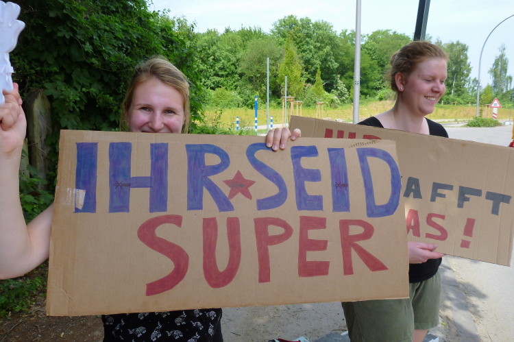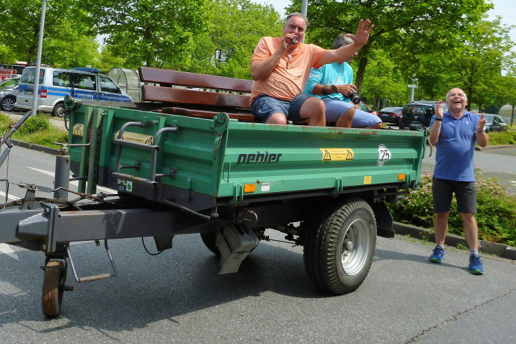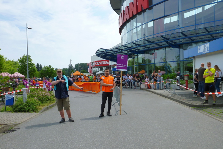 Der nächste Fanpoint und letzte Wechselpunkt aller Staffeln ist die Zeche Nordstern, die über 110 Jahre in Betrieb war. Erst 1986 wurde das Steinkohlenbergwerk geschlossen. Der Hauptsponsor, die Firma Vivawest, hat in der Anlage seine Hauptverwaltung. Der Turm von Schacht zwei wurde dazu ertüchtigt und oben eine Statue, der sogenannte Herkules von Gelsenkirchen daraufgesetzt. Markus Lüpertz hat diese Figur geschaffen. Am Ausgang des Fanpoints lese ich: „Noch sechs Kilometer“. Der Moderator kündigt jeden persönlich an.