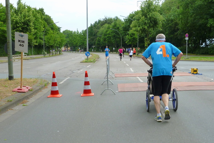 Nun geht es zurück nach Gelsenkirchen, die Temperaturen sind weiter gestiegen. Mittlerweile kippe ich mir an jeder Tankstelle Wasser über den Körper oder stelle mich gleich unter die Wasserdusche. Im Bereich des Möbelhauses ist die Hitze fast unerträglich. Nun sind 30 Kilometer geschafft. Die auf der anderen Seite entgegenkommenden Läufer haben erst die halbe Strecke. Im Team der 5.30 Stunden ziehen drei Zeitläufern zwei Männer, ein gutes Verhältnis. Vor einem Alten- und Pflegeheim hocken drei, vier Senioren an der Strecke. Die freuen sich, als der Fotograf auf sie zukommt und grüßt. Und auf der anderen Seite kommt mir Pumuckl entgegen. Der hat entweder viele Spenden gesammelt oder er war im Wirtshaus. Er hat noch ganz viele Kilometer vor sich.